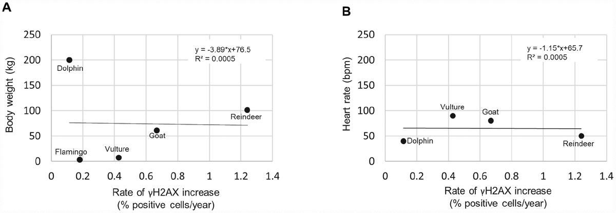 Figure 6.Rate of γH2AX increase correlated with species body weight and heart rate. (A) Body weight vs rate of γH2AX increase. (B) Heart rate vs rate of γH2AX increase.