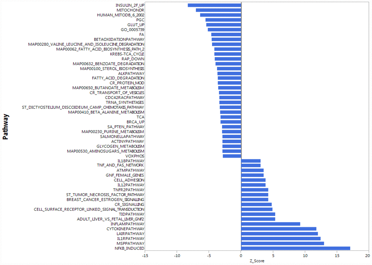 Figure 2. Gene expression analysis showing top 51 up- and down-regulated biological pathways in CD4+ T cells between older (70 to 80 years-old) and younger (20 to 30 years-old) men. Mitochondria-related and oxidative phosphorylation-related pathways were the most down-regulated pathways in older compared to younger donors. Differences of Z-scores between younger and older participants are shown on the X-axis. Each row denotes a different pathway (p ≤ 0.05 and FDR ≤ 0.3). N = 5 young, 19 old donors.