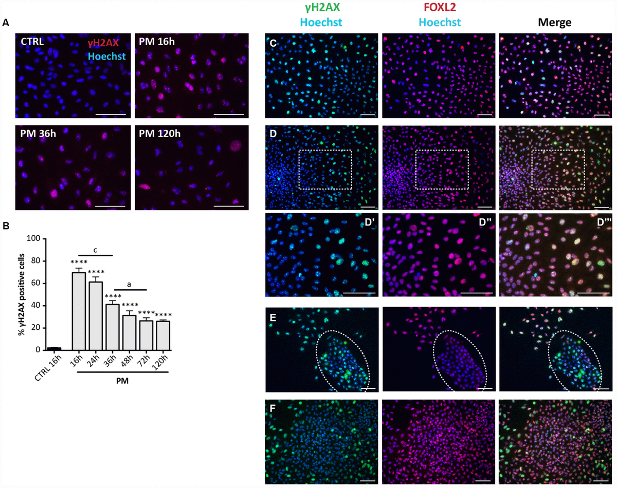 Figure 7. Analysis of PM-induced DNA damage in ovarian somatic cells. (A) Representative IF for γH2AX in somatic cells treated with PM. (B) The graph reports the quantification of γH2AX positive cells percentage. Data are shown as mean ± SEM of three experiments. Statistical differences vs control ****p<0.0001. CS 16 hrs vs CS 36 hrs c = p<0.001; CS 36 hrs vs CS 72 hrs a = p<0.05. Note an increase in the % of positive cells after 16 hrs of treatment followed by a progressive marked decrease up to 72 hrs. (C–F) Representative double IF for γH2AX (green) and FOXL2 (red) in (C) scattered fibroblastoid and epithelioid cells, (D) a large epithelioid colony (D’–D’’’ higher magnification images from D), (E) a little colony of small epithelioid cells (white circle) and (F) GCs from isolated secondary follicles after PM-treatment for 24 hrs. Scale bar = 100μm.