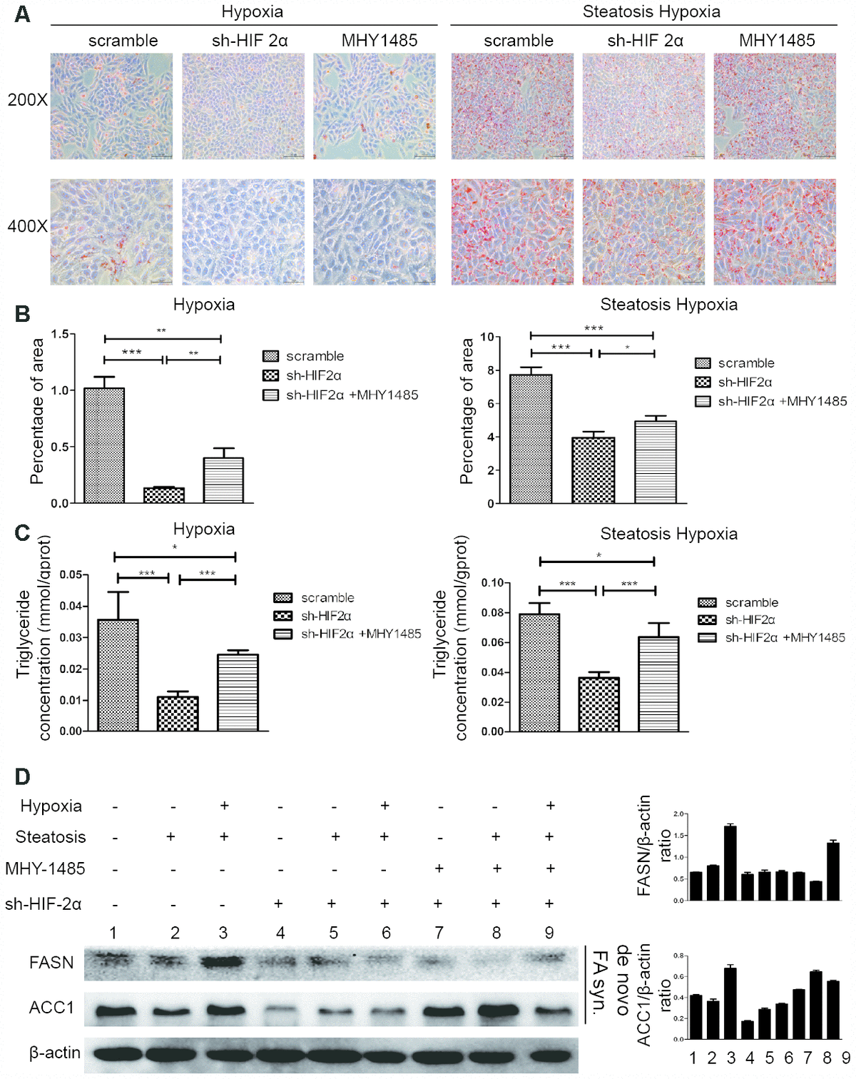 Figure 5. HIF-2α induces steatotic HCC lipid synthesis under a hypoxic microenvironment (A) Oil red O staining and quantification in HCC and steatotic HCC under hypoxic conditions in the presence or absence of MHY1485. (B, C) Triglyceride levels in HCC and steatotic HCC under hypoxic conditions in the presence or absence of MHY1485. (D) Western blot analysis of lipid synthesis-related proteins in HCC and steatotic HCC under hypoxic conditions. Densitometric analyses of the band intensity ratios for ACC1/β-actin and FASN/β-actin.