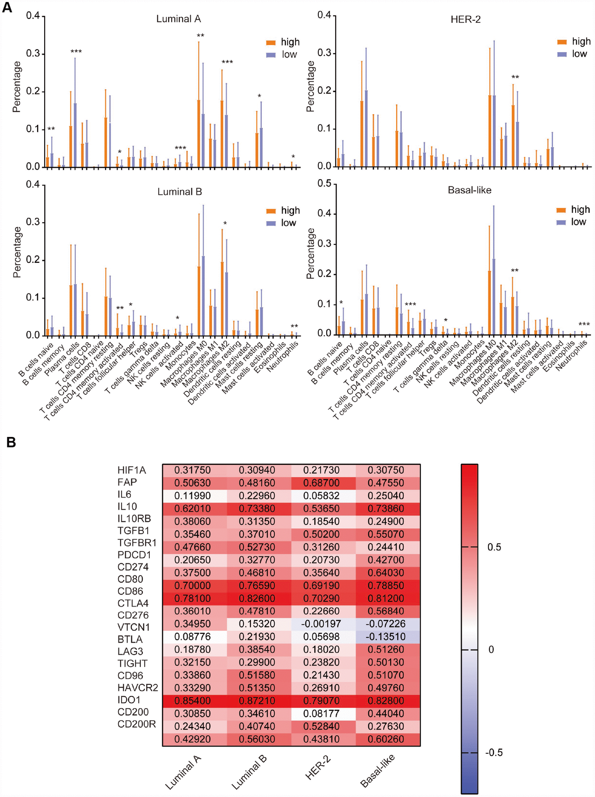Figure 7. Comparison of the expression of LM22 identified by CIBERSORT between high and low CD204 expression groups (A). Correlation of CD204 and immunosuppressive molecules among the luminal, HER2-positive, and basal-like subtypes of breast cancer (B).