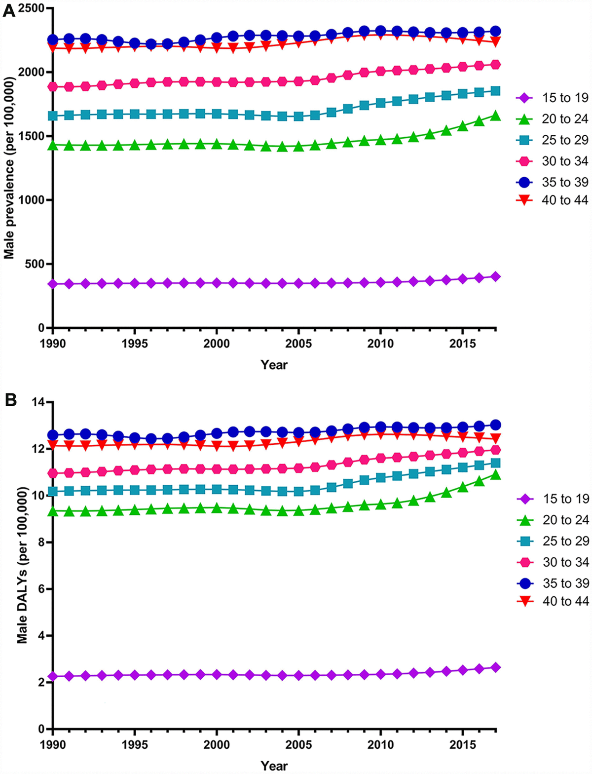 Figure 4.Trends in global disease burden of 15–44 year-old male infertility prevalence and DALYs from 1990–2017. (A) Prevalence; (B) DALYs).