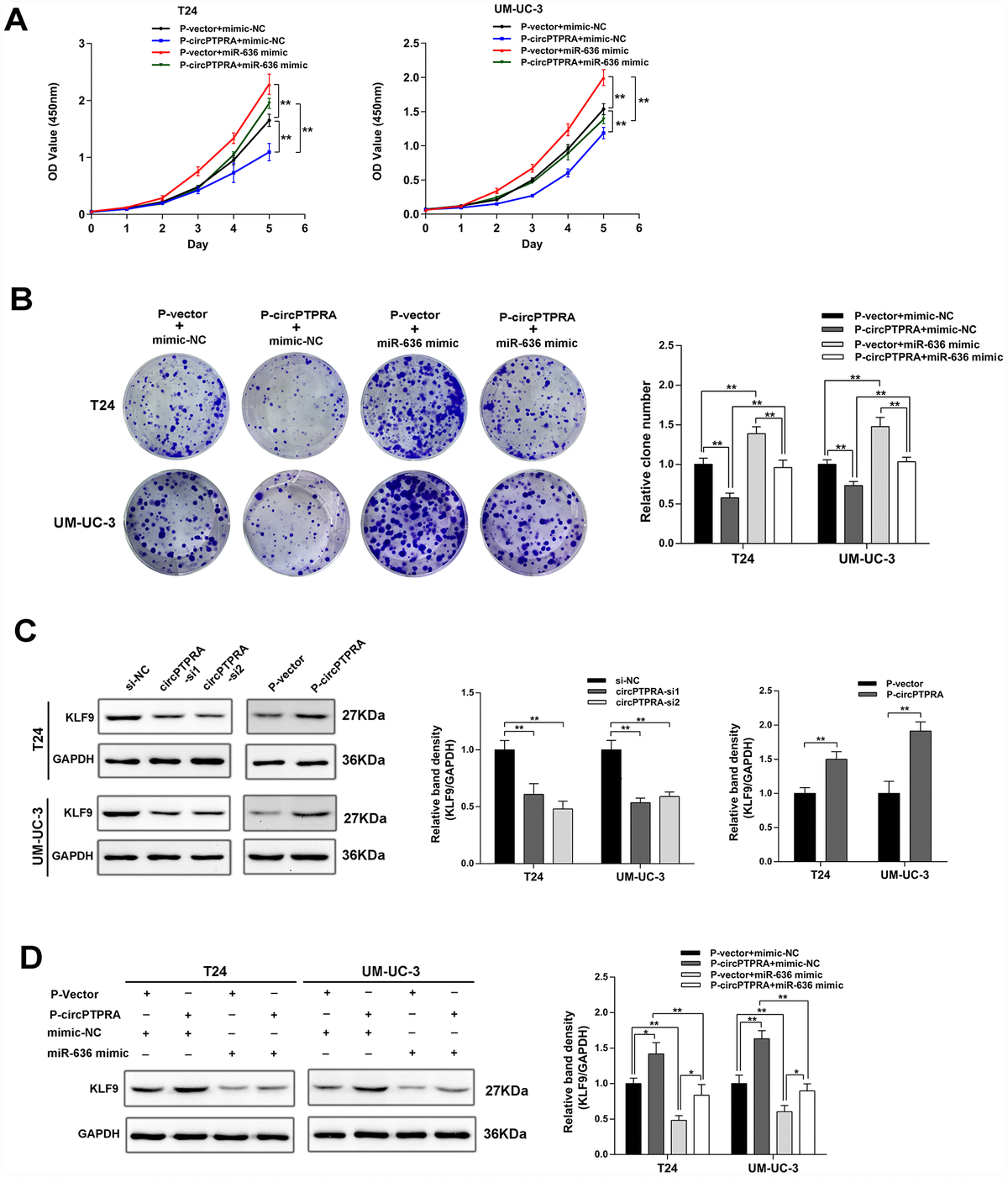 Figure 6. CircPTPRA regulates the expression of KLF9 by sponging miR-636. (A, B) The proliferative effect of circPTPRAon BC cells was partially abrogated by miR-636, evidenced by CCK-8 and colony formation assays. (C) Western blot results showing that circPTPRA upregulates the expression of KLF9. (D) Western blot results demonstrating that the upregulation of KLF9 by circPTPRA is partially abrogated by miR-636. Data are presented as the mean ± SD of three experiments. *P< 0.05, **P< 0.01(Student’s t-test).
