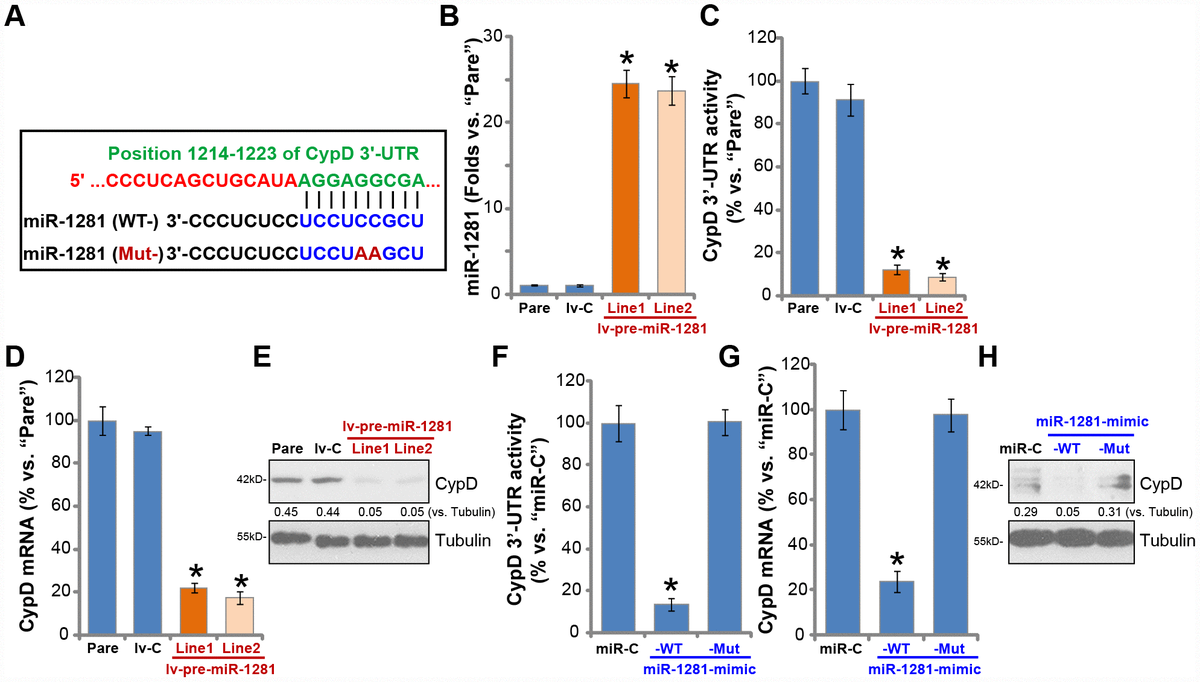 Figure 3. microRNA-1281 is CypD-targeting miRNA in human macrophages. microRNA-1281 (miR-1281) putatively targets position 1214-1223 in CypD 3’-UTR (3’-untranslated region) (A). The primary human macrophages were infected with lentivirus encoding pre-miR-1281 (“lv-pre-miR-1281”), two stable cell lines, “Line1/2”, were established following puromycin selection. Control macrophages were infected with non-sense microRNA (“lv-C”) lentivirus; Expression of mature miR-1281 and listed mRNAs was tested by qPCR assays (B and D); The relative CypD 3’-UTR activity was tested (C), with CypD protein expression tested by Western blotting (E). The primary human macrophages were transfected with 500 nM of control microRNA mimic (“miR-C”), the wild-type (“WT-”) or the mutant (“Mut-”) miR-1281 mimic (see sequences in A), after 48h CypD 3’-UTR activity (F), CypD mRNA (G) and protein (H) expression were tested. CypD protein expression was quantified, normalized to Tubulin (E and H). Data were presented as mean ± SD (n=5), and results were normalized. * P <0.05 vs. “Pare”/”miR-C” cells. Experiments in this figure were repeated five times with similar results obtained.