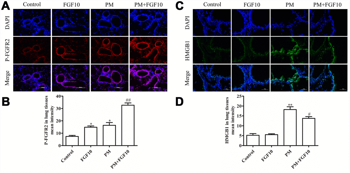 Figure 2. The FGF10 pretreatment and PM treatment led to p-FGFR2 activation in vivo, while FGF10 reduced the HMGB1 expression. Mice were intratracheally treated with 5 mg/kg of FGF10 solution at one hour in advance, after which these were intratracheally instilled with 100 μg of PM/day/mouse over two consecutive days. At two days post-PM exposure, the immunofluorescent detection of lung p-FGFR2 (A and B, scale bars = 100 μm) and HMGB1 (C and D) was conducted. DAPI (blue) was used for nuclear staining (scale bars = 50 μm).