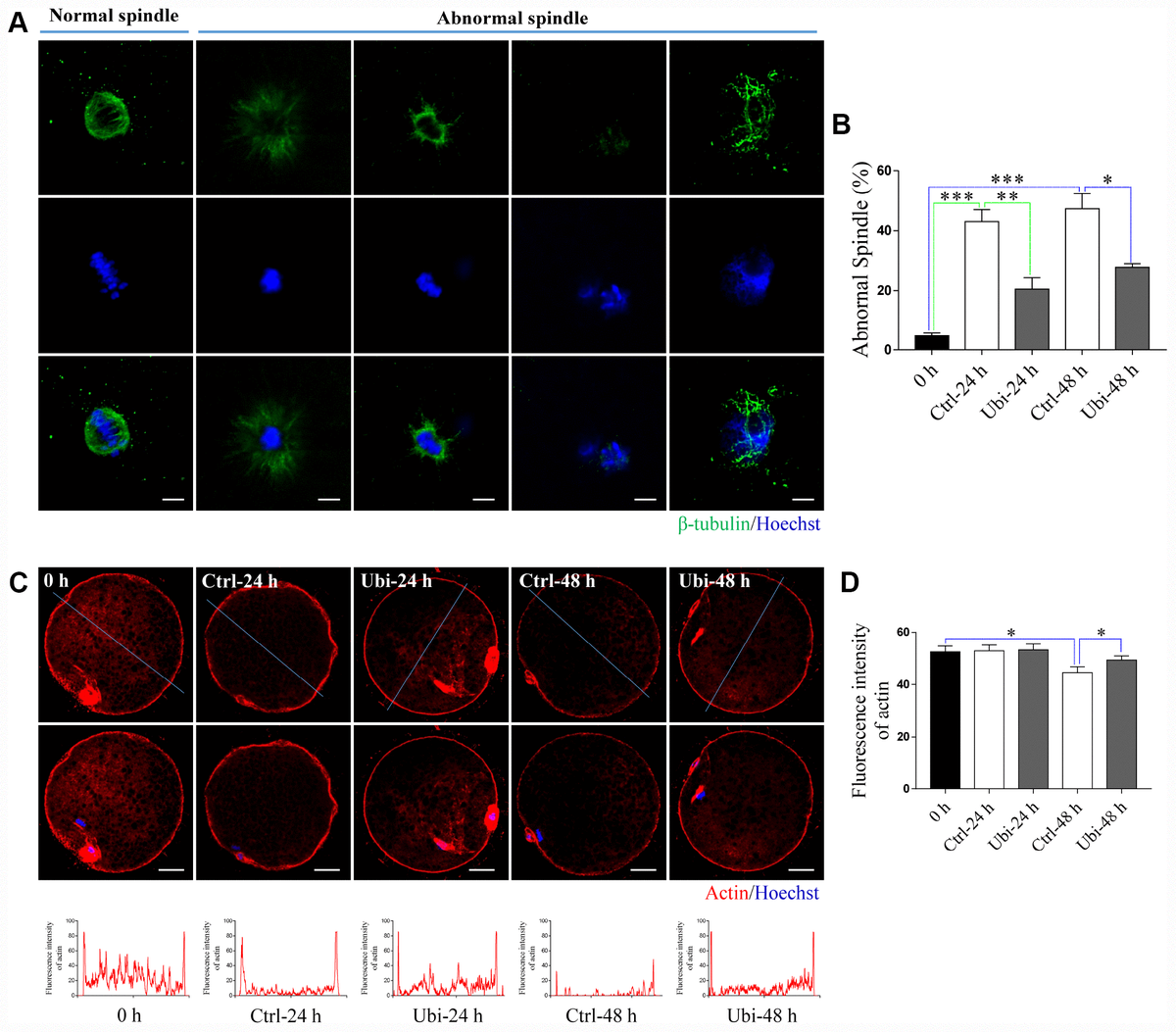 Figure 6. Ubiquinol-10 rescued aging-induced cytoskeleton impairment. (A) Representative confocal images of normal and abnormal spindles. Scale bars indicate 4 μm. (B) The ratio of abnormal spindle in 0 h, Ctrl-24 h, Ubi-24 h, Ctrl-48 h, and Ubi-48 h groups. Representative confocal images (C) and fluorescence intensity (D) of actin in 0 h, Ctrl-24h, Ubi-24 h, Ctrl-48 h, and Ubi-48 h groups. Scale bars indicate 20 μm. *p < 0.05 indicates significant differences.