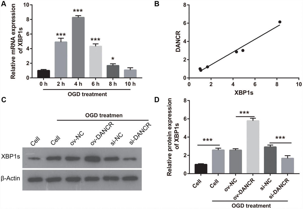 Figure 4. DANCR enhanced XBP1s expression in OGD treated BMECs. (A) XBP1s expression was measured using qRT-PCR after OGD treatment for 0, 2, 4, 6, 8, and 10 h. (B) DANCR expression was positively correlated with XBP1s expression. The relationship between DANCR expression and XBP1s expression was analyzed using Pearson’s analysis. (C) XBP1s expression were measured using western blot after transfection with DANCR-pcDNA3.1 and si-DANCR at 48 h and then treated with OGD for 4 h. (D) The bar represents the protein expression of XBP1s. *P<0.05, ***P<0.001.