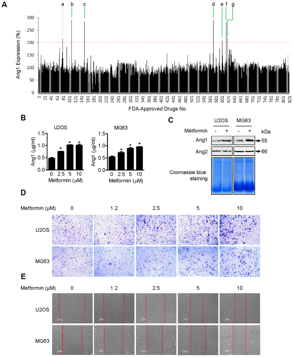 Figure 1. Induction of Ang1 expression and activation of cell mobility by metformin. (A) Screening result of FDA-approved drugs for Ang1 expression by ELISA. U2OS cells were seeded on 96-well plates. After treating cells with drugs for 1 h, each cell culture medium was transferred to a 96-well plate from the ELISA assay kit. Compounds that induced Ang1 expression over two-fold compared with DMSO vehicle control were selected and are listed in