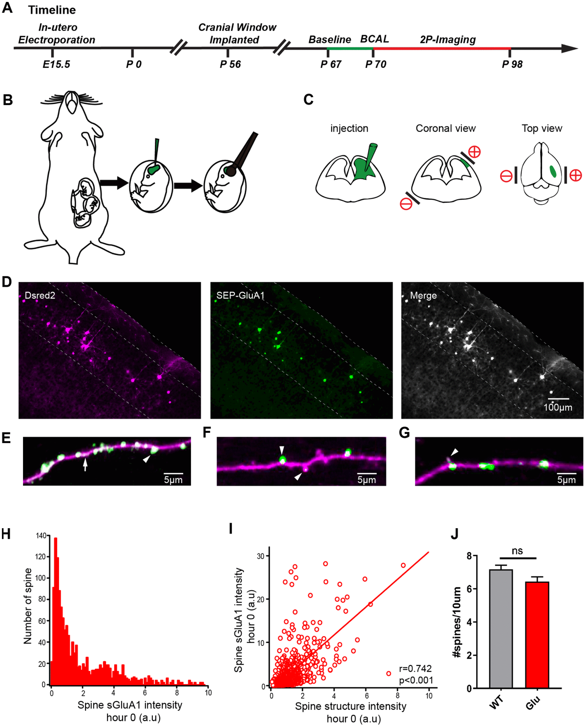 Figure 4. Expression of SEP-GluA1 in layer 2/3 somatosensory cortex neurons in vivo. (A) Timeline of experimental design. The green line and the red line indicates the two-photon imaging time course. (B, C) Schematic drawing of in utero electroporation. +/- means positive and negative polar, respectively. (D) Representative images showing expression of dsRed2 (purple), SEP-GluA1 (green) and their overlap (white). (E–G) SEP-GluA1 in green, dsRed2 in magenta, and their overlap in white. (H) Histogram of spine sGluA1 intensity before BCAL at hour 0. (I) Correlation between spine sGluA1 and spine size before BCAL at hour 0. n= 1381 spines. r, Pearson's linear correlation coefficient, p value is from Monte-Carlo shuffling. (J) Quantification of spine density. n= 27 neurons in 5 control mice, 24 neurons in 5 Glu mice. ns, not significant, Student’s t-test. Error bars = s.e.m.
