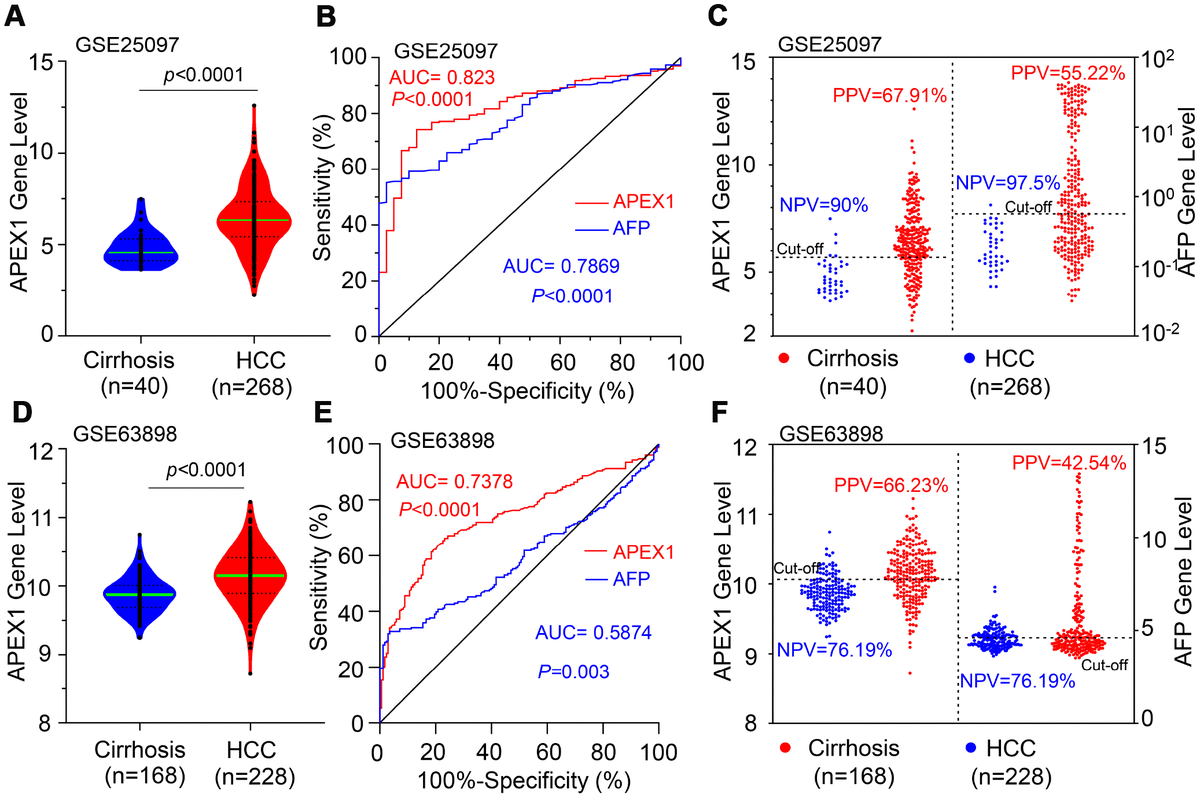 Figure 4. APEX1 shows a higher positive predictive value than AFP in HCC patients. (A) The histogram plot shows APEX1 mRNA levels in patients with liver cirrhosis (n=40) and HCC (n=268) from the GSE25097 dataset. (B) ROC curve analysis shows the diagnostic value of APEX1 and AFP in liver cirrhosis and HCC patients from the GSE25097 dataset. (C) The optimal cut-off value for APEX1 and AFP in liver cirrhosis and HCC patients was determined according to the Youden and Product indices. Also shown are the positive predictive value (PPV) and negative predictive value (NPV) for APEX1 and AFP. (D) The histogram plot shows relative APEX1 mRNA levels in patients with liver cirrhosis (n=168) and HCC (n=228) from the GSE63898 dataset. (E) ROC curve analysis shows the diagnostic values of APEX1 and AFP in the liver cirrhosis and HCC patients from the GSE63898 dataset. (F) The optimal cut-off values for APEX1 and AFP in the liver cirrhosis and HCC patients was determined according to the Youden and Product indices. Also shown are the PPV and NPV for APEX1 and AFP.