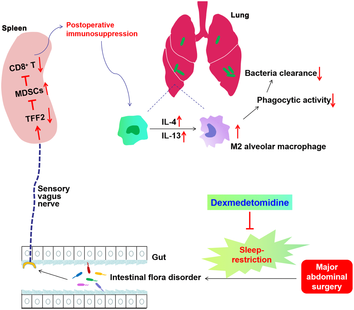 Figure 9. Schematics illustrating the signaling mechanisms of sleep-restriction in postoperative immunosuppression and its treatment by dexmedetomidine. Sleep-restriction exaggerates intestinal flora disorder, furtherly decreases splenic trefoil factor 2 (TFF2) expression, which subsequently leads to the increase in myeloid-derived suppressor cells (MDSCs) numbers and decrease in splenic CD8+ T cells activity. Subdiaphragmatic vagus nerve (SVN) served as an important conduit of gut microbiota-spleen communication. SR-induced exaggeration of postoperative immunosuppression was characterized by increased expression of IL-4 and IL-13 in the lung, increased M2 polarization of alveolar macrophages (AMs), decreased phagocytic activity of AMs and thus decreased antimicrobial activity in E. coli pneumonia. Dexmedetomidine treatment during SR alleviated SR-induced decrease in postoperative immunosuppression through gut microbiota and SVN.