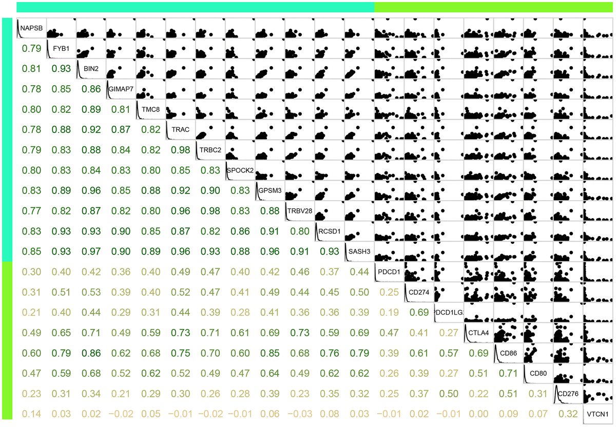 Figure 9. Correlation between the 12 immune microenvironment genes (blue green bar) and 8 immune checkpoint genes (light green bar). Lower panel was Pearson correlation coefficient between each gene. Upper panel was scatter plot of expressions between each gene. Diag panel was expression of each gene.