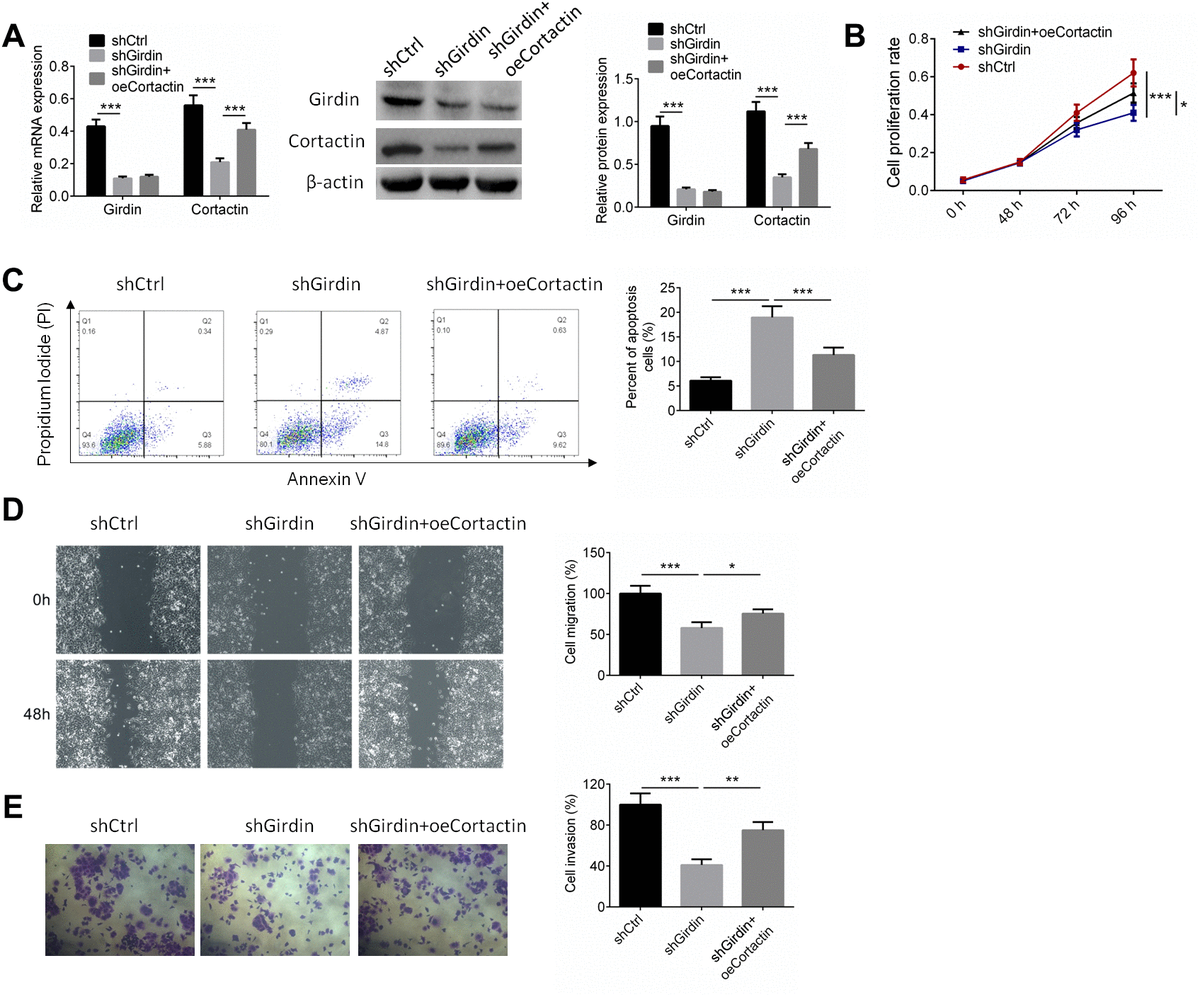 Figure 7. Cortactin over-expression reversed the effect of shGirdin on PANC-1 cells. PANC-1 cells were transfected with shNC, shGirdin+oeNC, and shGirdin+oeCortactin. (A) RT-PCR and western blot analysis were employed to detect the expressions of Girdin and Cortactin. (B–E) Cell proliferation, apoptosis, migration and invasion was identified by CCK8, APC/PI staining, wound healing, and transwell assays, respectively. Data was shown as mean ± SD. *P<0.05, **P<0.01, ***P<0.001. The experiments were repeated 3 times.