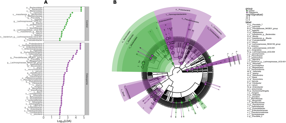 Figure 3. Discriminative taxa between postmenopausal osteopenia and control. (A) The point plot of LDA (Linear discriminant analysis) shows the features detected as statistically and biologically differential taxa between the different communities. (B) The taxonomic representation of statistically and biologically differences between postmenopausal osteopenia and control. The color of discriminative taxa represents the taxa is more abundant in the corresponding group (Control in green, postmenopausal osteopenia in purple). The size of point shows the negative logarithms (base 10) of p-value. The bigger size of point shows more significant (lower p-value).