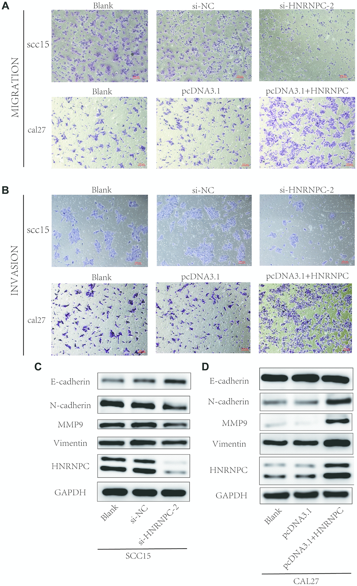 Figure 6. Detection of migration and invasion abilities. (A, B) Migration and invasion abilities were detected in scc15 cell line and cal27 cell line. Overexpression of HNRNPC promoted OSCC cells migration and invasion, and it was oppositely in knockdown of HNRNPC. (C, D) EMT markers were detected with Western bolt assay. Activation of EMT pathway accelerated the migration and invasion of OSCC.