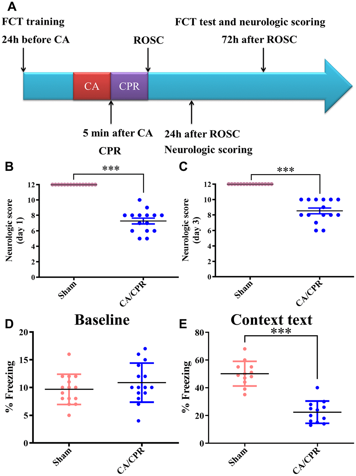 Figure 1. Neurological function was severely impaired in mice after CA/CPR. (A). Scheme of the experimental design. (B, C). Day 1 (B) and day 3 (C) average neurologic scores after ROSC. (D). Baseline freezing levels in the two groups. (E). Freezing levels of context text on day 3 after resuscitation. n=15 per group. ***P < 0.001. FCT, fear-conditioning test; CA/CPR, cardiac arrest/cardiopulmonary resuscitation; ROSC, restoration of spontaneous circulation.
