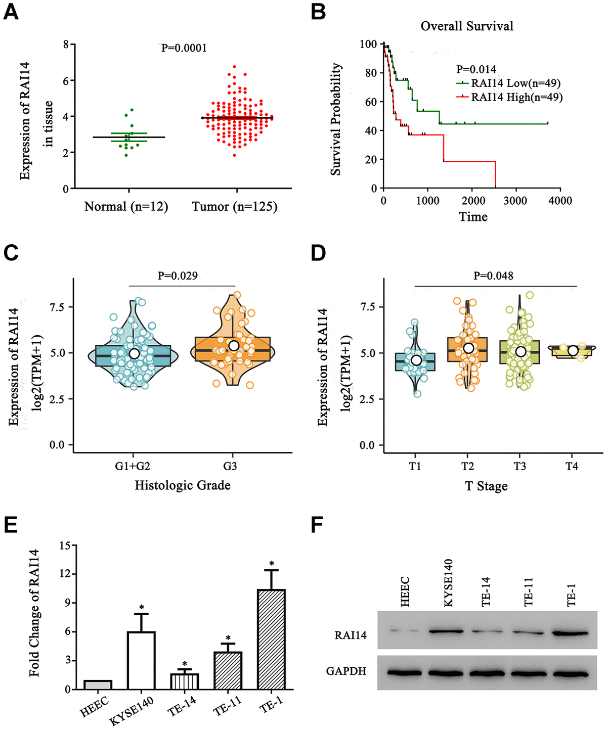 Figure 1. RAI14 is upregulated in EC. (A) The expression of RAI14 was upregulated in 125 esophageal tumor tissue samples (Tumor) as compared with that in 12 adjacent normal esophageal tissue samples (Normal) in TCGA. (B) Kaplan–Meier overall survival curves of EC patients stratified by high and low expression of RAI14. (C) The association between the expression of RAI14 and histologic grade. (D) The association between the expression of RAI14 and T stage. (E) qPCR analysis of RAI14 mRNA levels in EC cell lines and the esophageal epithelial cell line (HECC). (F) RAI14 protein levels in the EC cell lines and HECC line were determined by Western blotting. Average RAI14 mRNA and protein levels were normalized to the expression of GAPDH. Three independent experiments were conducted for each assay. *P < 0.05 vs HEEC.