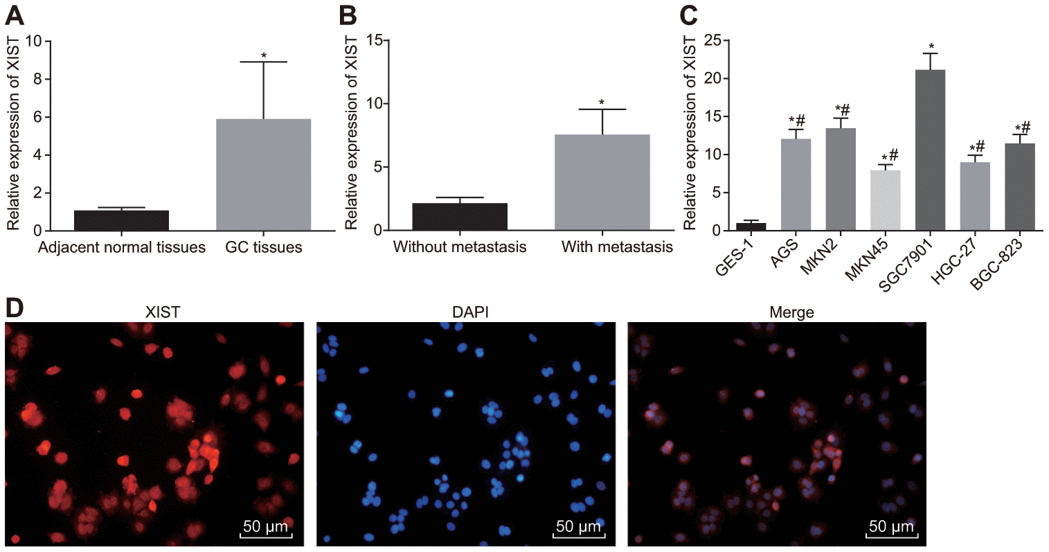 Figure 1. LncRNA XIST is highly expressed in gastric cancer tissues and cell lines. (A) Relative expression of lncRNA XIST in gastric cancer tissues (n = 65) and the adjacent normal tissues determined by RT-qPCR; *, p < 0.05 compared with adjacent normal tissues; (B) Relative expression of lncRNA XIST in gastric cancer tissues from patients with metastasis (n = 45) and without metastasis (n = 20) determined by RT-qPCR; *, p < 0.05 compared with gastric cancer tissues from patients without metastasis; (C) Relative expression of lncRNA XIST in different gastric cancer cell lines; *, p < 0.05 compared with the normal cells; #, p < 0.05 compared with the SGC7901 cells; (D) the representative images of localization of lncRNA XIST merged with DAPI wherein red signal represented lncRNA XIST and blue signal represented cell nucleus (× 200). All measurement data and statistical results were expressed as mean ± standard deviation. Comparisons between two groups were analyzed by t-test, while comparisons among multiple groups were analyzed using one-way ANOVA. The experiment was repeated 3 times.
