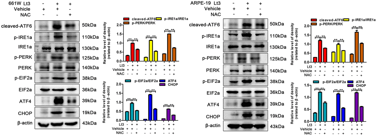 Figure 5. NAC treatment suppresses light-induced ER stress in photoreceptors and RPEs. The cells were treated with NAC (5 mM for 661W cells; 2.5 mM for ARPE-19 cells) or vehicle and cultured under light/dark conditions for 3 days, the levels of ER stress markers were determined with western blotting, and β-actin was referenced as an internal control. Three independent experiments are conducted two weeks apart. The results are presented as the mean± SEM. n (per group) =3, **P < 0.01.