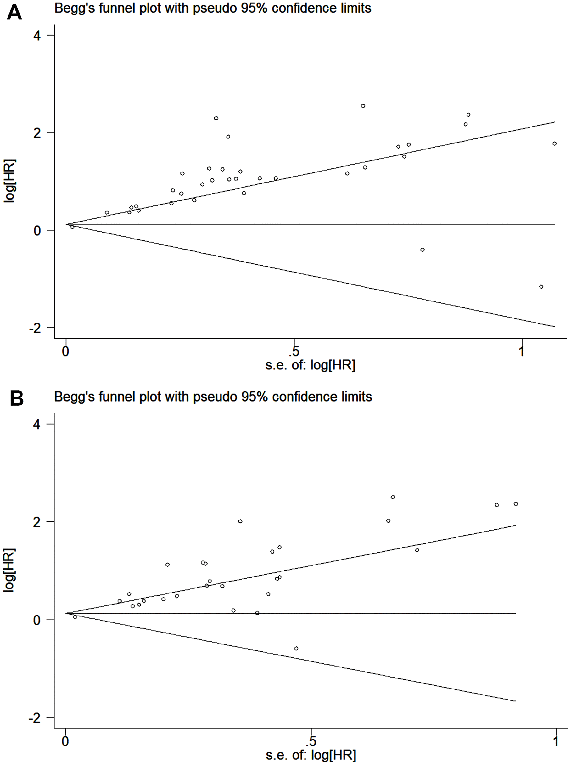 Figure 4.Funnel plot for the assessment of publication bias of the included studies. (A) The original HRs of OS analyzed by univariate analysis. (B) The original HRs of OS analyzed by multivariate analysis.