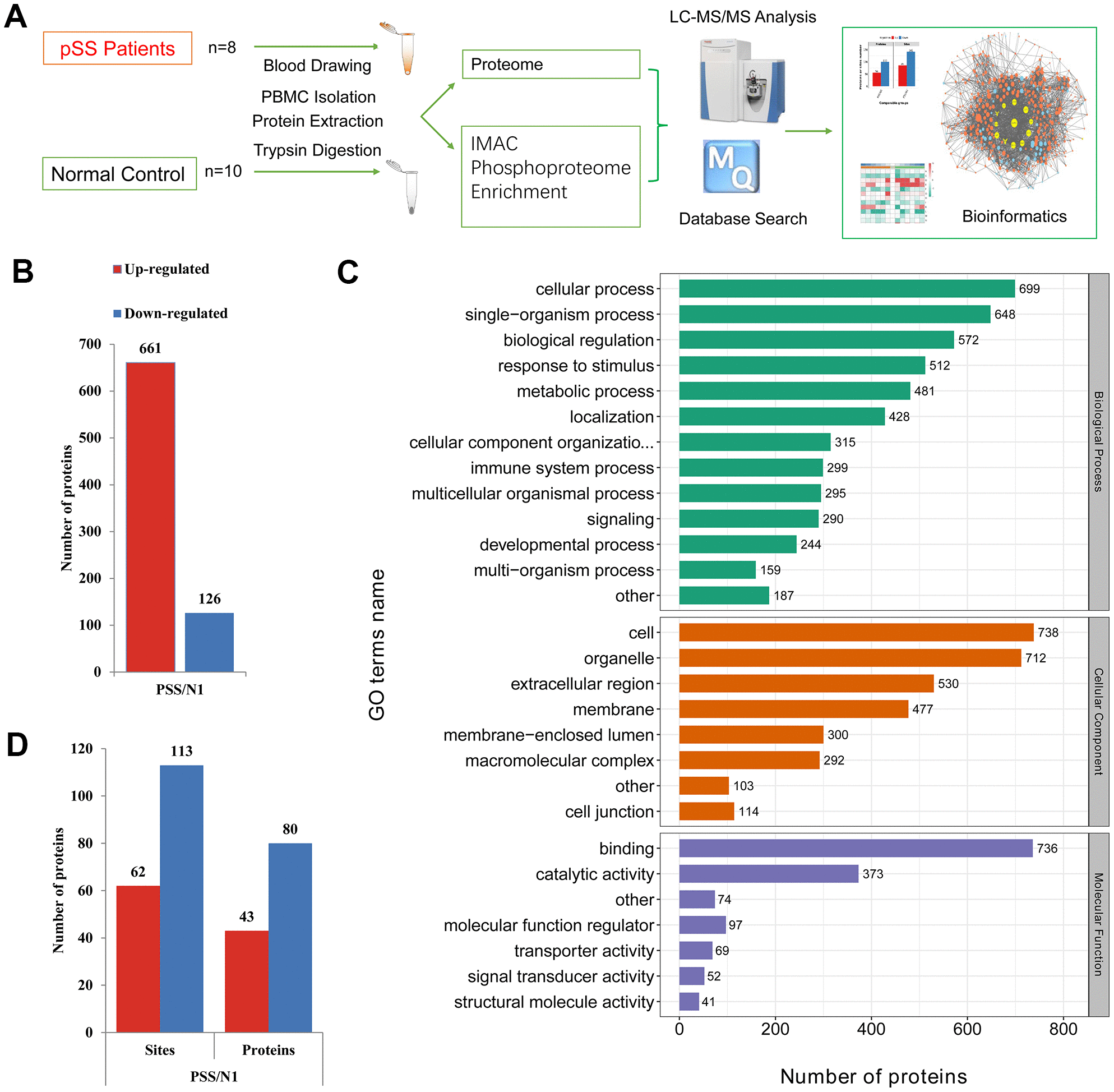 Figure 1. (A) The schematic flow to study the proteome and phosphoproteome of peripheral blood mononuclear cells (PBMCs) in primary Sjögren syndrome (pSS) patients. (B) Histogram of quantity distribution of differentially expressed proteins (DEPs). (C) Gene Ontology (GO) classifications of the DEPs of PBMCs in pSS patients based on biological process, cellular component and molecular function. (D) Histogram of quantity distribution of differentially expressed phosphorylated proteins (DPPs). IMAC: immobilized metal affinity chromatography. LC-MS: liquid chromatography–mass spectrometry.