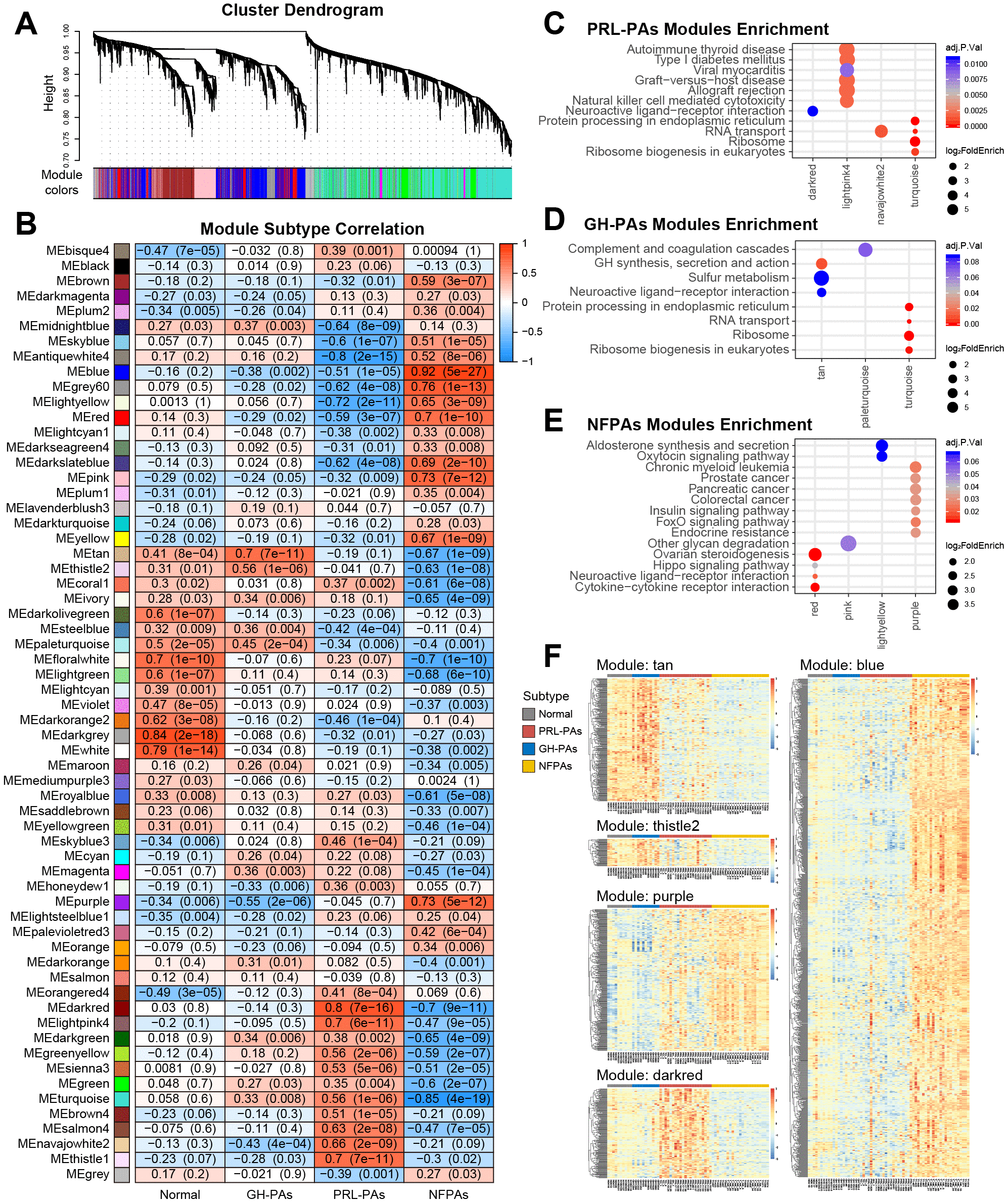 Figure 2. Weighted gene correlation network analysis (WGCNA) of transcriptome data reveals subtype specific coexpression modules. (A) WGCNA cluster dendrogram groups genes into distinct gene coexpression modules defined by dendrogram branch cutting. (B) Modules-subtype correlation heatmap of three PA subtypes and normal tissues. The cells in the heatmap were colored by the correlation between eigengene expression and each sample group, the correlation coefficients and P values were indicated in each cell. (C–E) KEGG pathway enrichment analysis of genes in the modules significantly associated with different PA subtypes. Adjusted P value < 0.05. (F) Expression profiles of genes in key modules associated with PA subtypes.