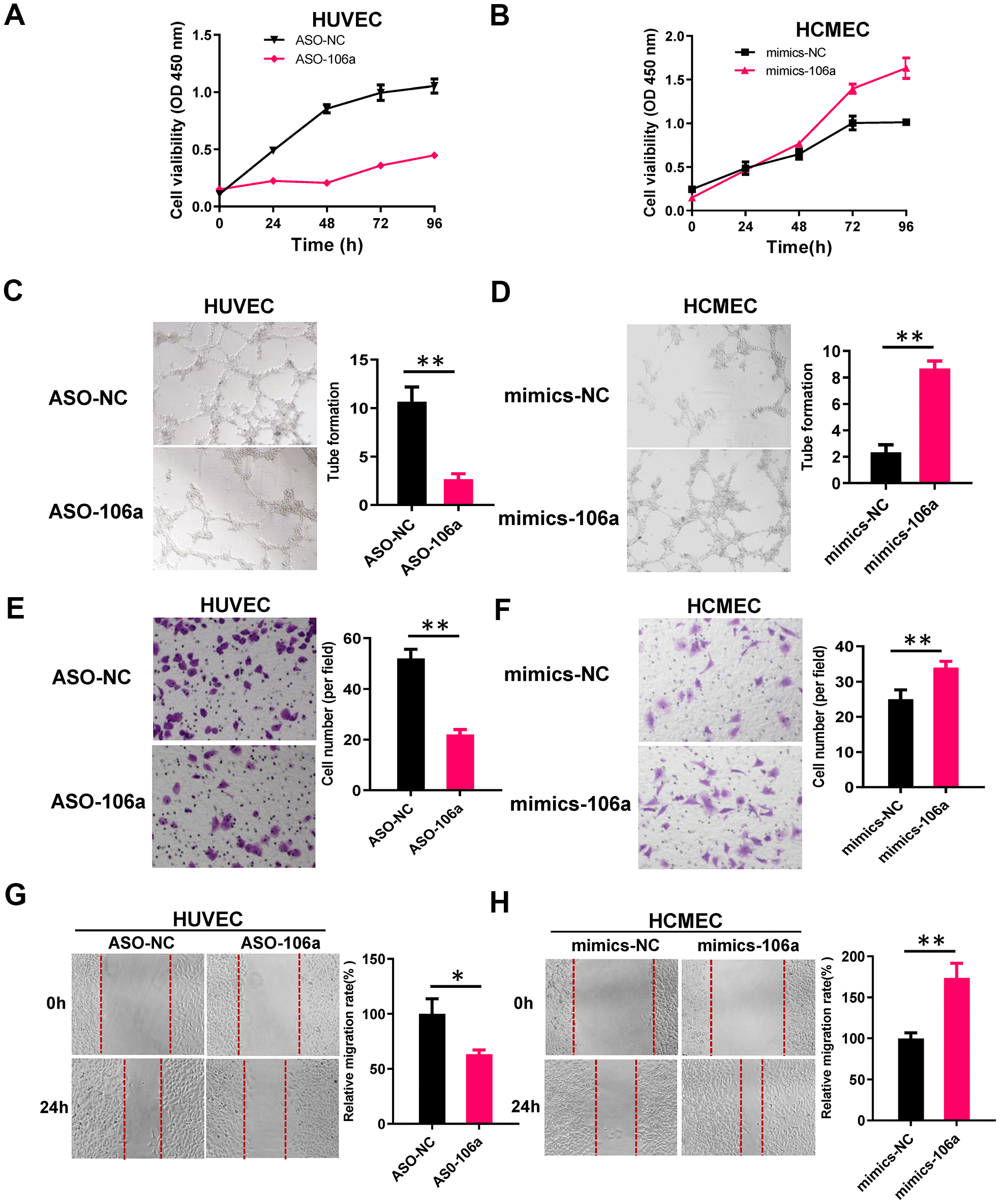 Figure 3. MiR-106a enhances the angiogenic abilities of endothelial cells. (A, B) CCK-8 assays were used to determine the growth curves of HUVECs transfected with ASO-106a or ASO-NC (A) and HCMECs transfected with mimics-106a or mimics-NC (B). (C, D) Tube formation was assessed in HUVECs transfected with ASO-106a or ASO-NC (C) and HCMECs transfected with mimics-106a or mimics-NC (D). (E, F) Transwell chambers were used to perform cell migration assays in HUVECs transfected with ASO-106a or ASO-NC (E) and HCMECs transfected with mimics-106a or mimics-NC (F). (G, H) Wound healing assays were performed to assess cell motility in HUVECs transfected with ASO-106a or ASO-NC (G) and HCMECs transfected with mimics-106a or mimics-NC (H). Data are presented as the mean of three experiments, and the error bars represent the SD (*P<0.05 and **P<0.01).