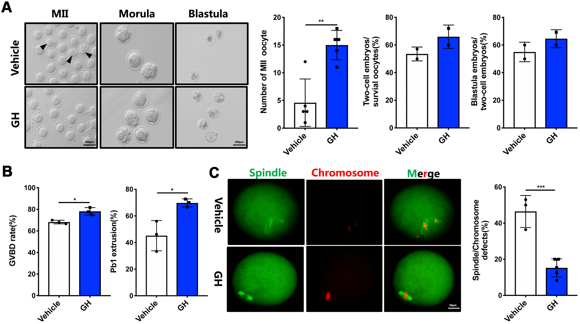 Figure 4. Effects of GH treatment in vivo on the quality and meiotic progress of aged oocytes. (A) Left: Representative images of MII oocytes, morula and blastocysts from NS-treated and GH-treated mice. Black arrows point to fragmented MII oocytes. Scale bar, 200 μm, 100 μm. Right: Number of MII oocytes and percentage of 2-cell embryos and blastocysts in NS-treated and GH-treated mice. (B) After cultured in M2 medium, the rate of GVBD and Pb1 extrusion were recorded. (C) Left: The MII oocytes from NS-treated (n = 37) and GH-treated (n = 42) mice were stained with α-tubulin (green) and propidium iodide (PI) (red). Scale bar, 50 μm. Right: Quantification of NS-treated and GH-treated oocytes with abnormal spindle/chromosomes. Data are presented as mean ± SD. *P < 0.05, **P < 0.01, ***P < 0.001.