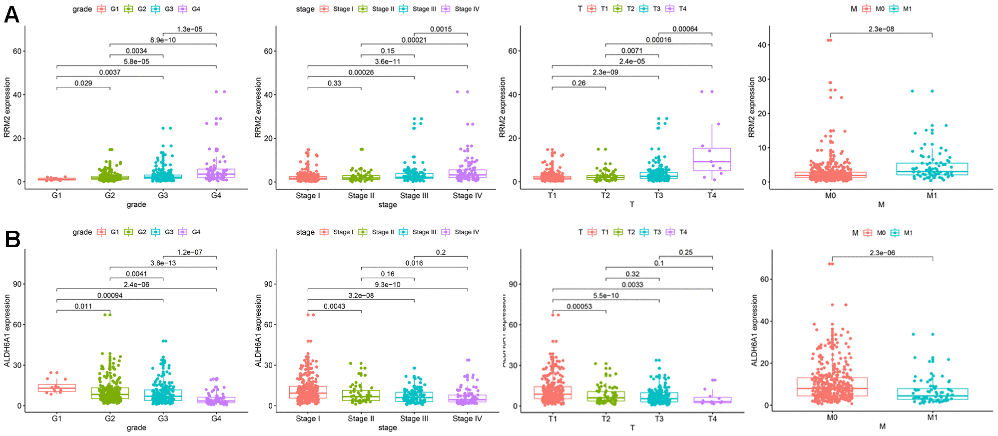 Figure 5. Correlation between the expression of each signature gene and clinical parameters. (A) RRM2. (B) ALDH6A1.