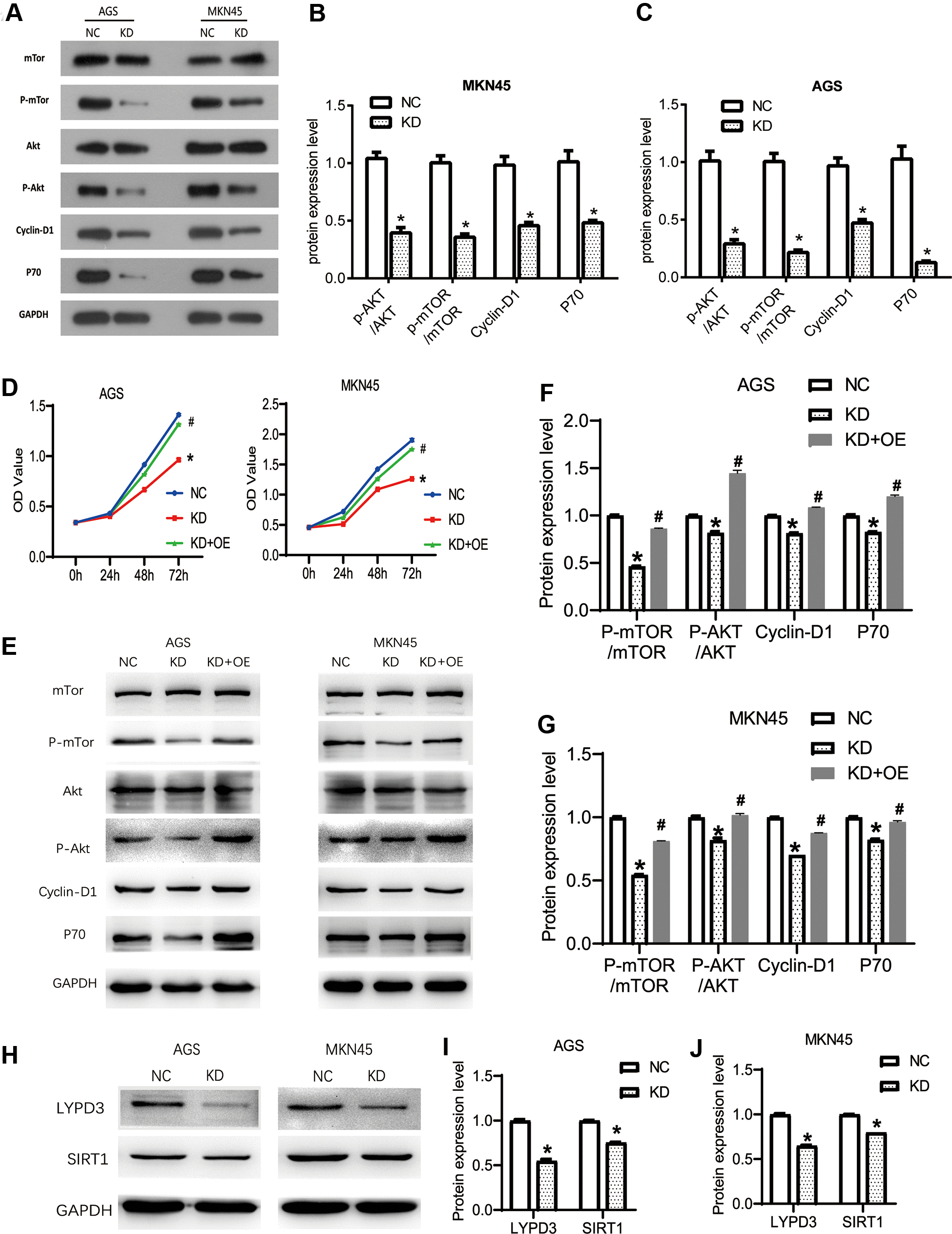 Figure 6. The knockdown of OGFRP1 inhibited tumor progression by activating the AKT/mTOR pathway in human gastric cancer cells. (A) The activities of AKT/mTOR pathway-related proteins were analyzed using western blot. Statistical analysis of protein expression levels in MKN45 (B) and AGS (C) cells were performed using the t-test. (D) OGFRP1 overexpression plasmid was transfected into OGFRP1 knockdown cells (KD+OE group). CCK8 was performed to detect the proliferation of MKN45 and AGS cells. (E) The levels of AKT/mTOR pathway-related proteins were detected by western blot in AGS (F) and MKN45 (G) cells. (H) The expression levels of LYPD3 and SIRT1 were detected by western blot in AGS (I) and MKN45 (J) cells. *P<0.05.