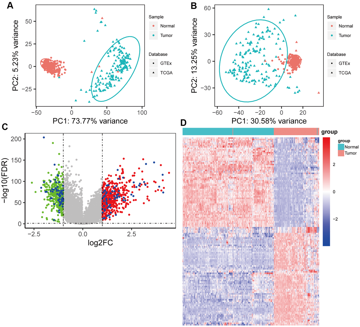 Figure 2. Identification of resistance-related differentially expressed genes (RRDEGs) in pancreatic cancer. (A) Principle component analysis (PCA) plot of the data merged from The Cancer Genome Atlas (TCGA) and Genotype-Tissue Expression (GTEx) datasets before removing the batch effect. (B) PCA plot of the data merged from TCGA and GTEx datasets after removing the batch effect. (C) Volcano plot of DEGs between tumor tissues and normal tissues. The red and green points are DEGs, and RRDEGs are plotted with blue points. The lines were drawn where the absolute value of log2FC is equal to 1 and FDR is equal to 0.05. (D) Heatmap showing the expression of RRDEGs.