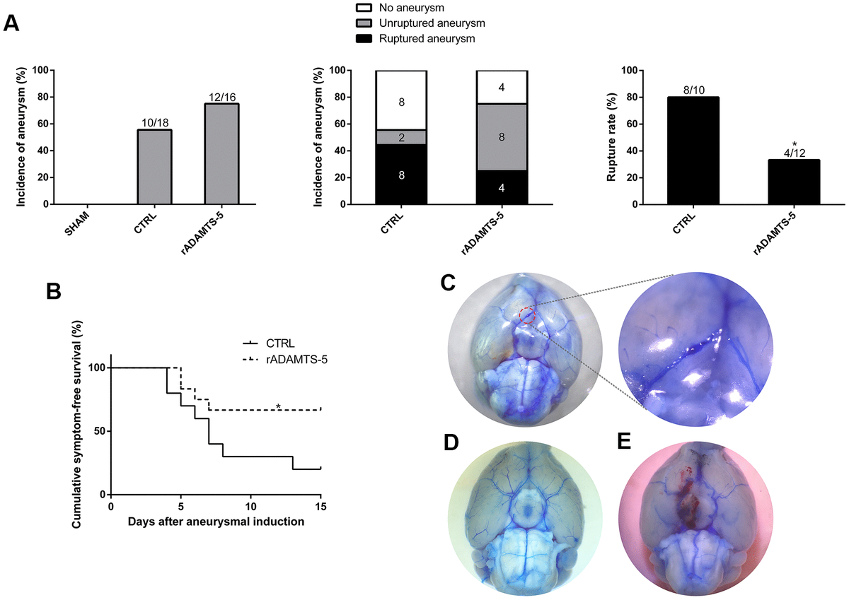 Figure 2. Effects of recombinant protein ADAMTS-5 on the development of aneurysmal rupture in male mice. (A) Incidence of aneurysm and rupture rate in sham mice, control (CTRL) IA mice, and recombinant protein ADAMTS-5-administered (rADAMTS-5) IA mice. (B) Symptom-free curve (Kaplan-Meier analysis curve) demonstrated a significant increase in survival in the rADAMTS-5 treatment cohort (log-rank P<0.05). (C) Unruptured aneurysm. (D) No aneurysm. (E) Ruptured aneurysm. *P<0.05, **P<0.01.