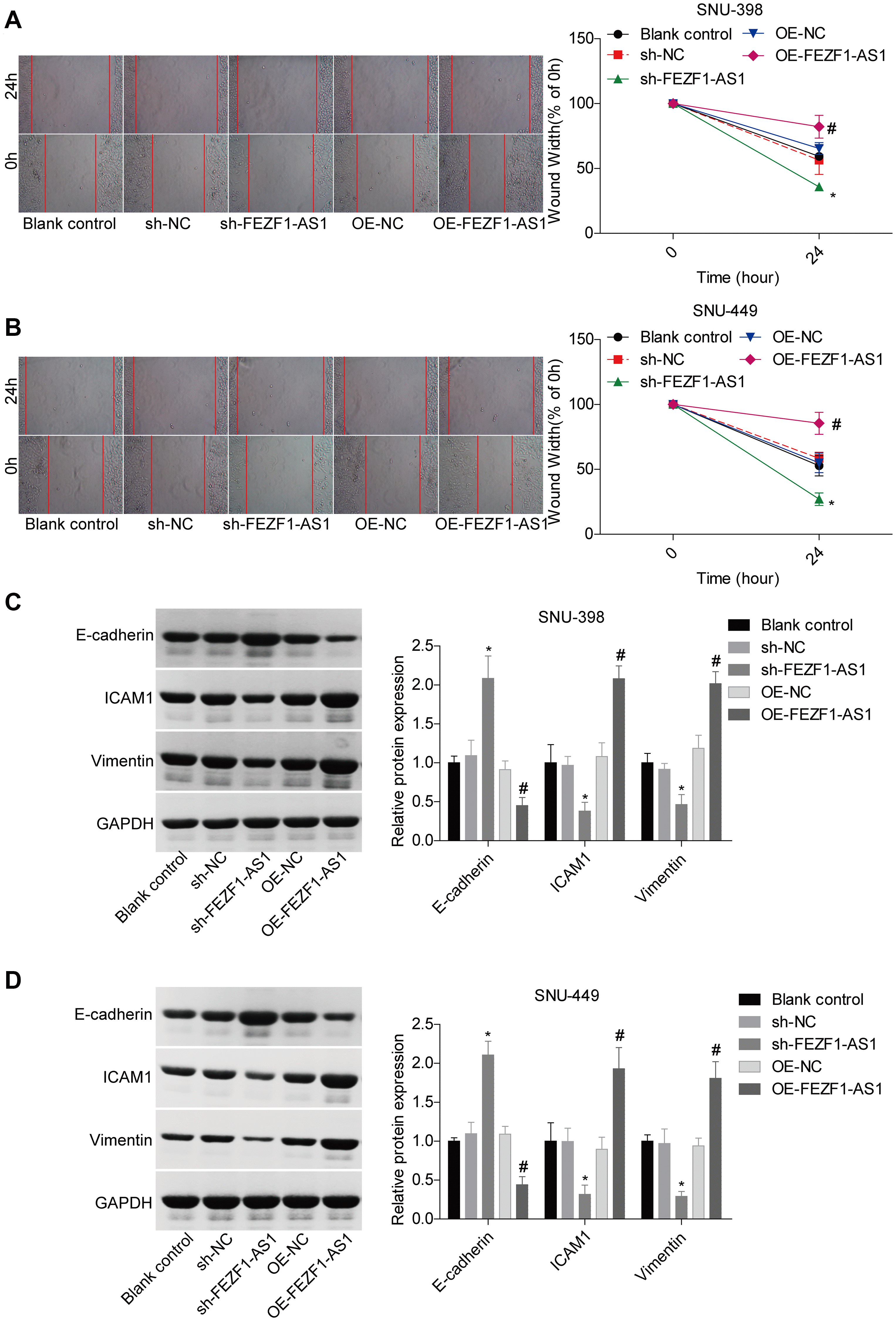 Figure 3. FEZF1-AS1 promoted the migration and EMT of HCC cells. (A, B) Wound healing assay was adopt to detect the migration of SNU-398 and SNU-449 cells, *P < 0.05, #P < 0.05. (C, D) Western blot was used to detect the expression levels of EMT markers, E-cadherin, ICAM1 and Vimentin, *P < 0.05, #P < 0.05.