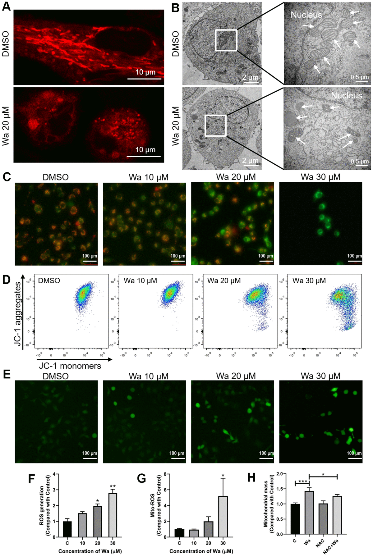 Figure 2. Warangalone causes to mitochondrial damage via ROS. (A, B) MDA-MB-231 cells were treated with 20 μM warangalone for 12 h. The mitochondria were stained with MitoTracker™ Red CMXRos 30 min, and observed by (A) confocal laser scanning microscopy (CLSM) (mitochondria emit red) and (B) transmission electron microscopy (TEM) (arrows mark mitochondria). (C, D) MDA-MB-231 cells were treated with the indicated concentrations of warangalone for 12 h. Fluorescence microscopy (C) and flow cytometry (D) were used to detect the mitochondrial membrane potential. JC-1 aggregates emit orange, and JC-1 monomers emit green. (e-g) MDA-MB-231 cells were treated with the indicated concentrations of warangalone for 12 h. Whole cell ROS was detected through fluorescence microscope (E) and fluorescence spectrophotometry (F). ROS labeled with DCFH-DA emit green (E). MitoSOX was used to specifically detect mitochondrial superoxides through flow cytometry (G). (H) MDA-MB-231 cells were pretreated with NAC (5 mM) for 1 h, and cultured with warangalone (20 μM) for 12 h. The mitochondria were stained with MitoTrackerTM Red CMXRos for 30 min and flow cytometry was used to detect mitochondrial mass. One-way ANOVA was used for statistical analysis (n ≥ 3). *P < 0.05, **P < 0.01, ***P < 0.001 compared to the respective control group.