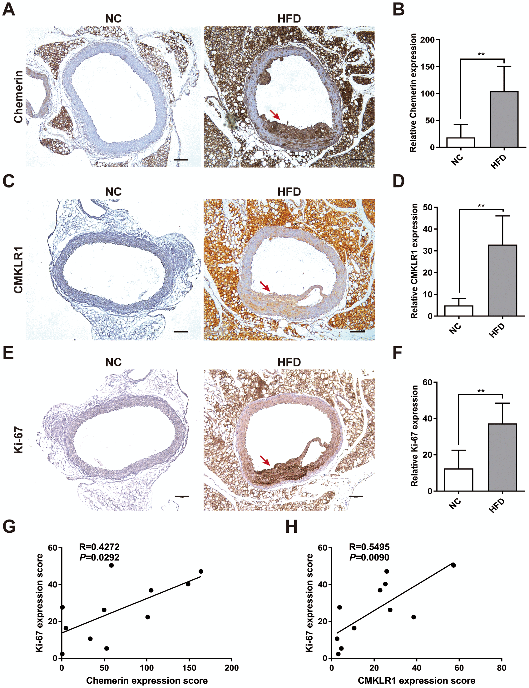 Figure 1. Chemerin / CMKLR1 is overexpressed in the aorta tissues of HFD ApoE-/- mice. A high fat diet (HFD) apo-lipoprotein E−/− (ApoE-/-) mouse model was established to determine the expression of the chemerin / chemokine-like receptor 1 (CMKLR1) axis in atherosclerotic aorta tissues. (A) Immunohistochemical (IHC) analysis of chemerin expression in aorta tissues of negative control (NC, n = 5) and HFD (n = 6) mice. Scale bar = 100 μm. Red arrows indicate plaques. (B) The chemerin expression score analysis data are presented as means ± standard deviations (SDs). **, p< 0.01. (C) Representative images of CMKLR1 expression in aorta tissues following IHC analysis. Scale bar = 100 μm. Red arrows indicate plaques. (D) CMKLR1 expression score analysis. **, p< 0.01. (E, F) IHC analysis of Ki-67 expression in the aorta tissues of normal and HFD mice. Scale bar = 100 μm. Red arrows indicate plaques. Data from Ki-67 expression score analysis are presented as means ± SDs. **, p< 0.01. (G, H) The correlations of chemerin / CMKLR1 and Ki-67 were calculated using the Spearman method.
