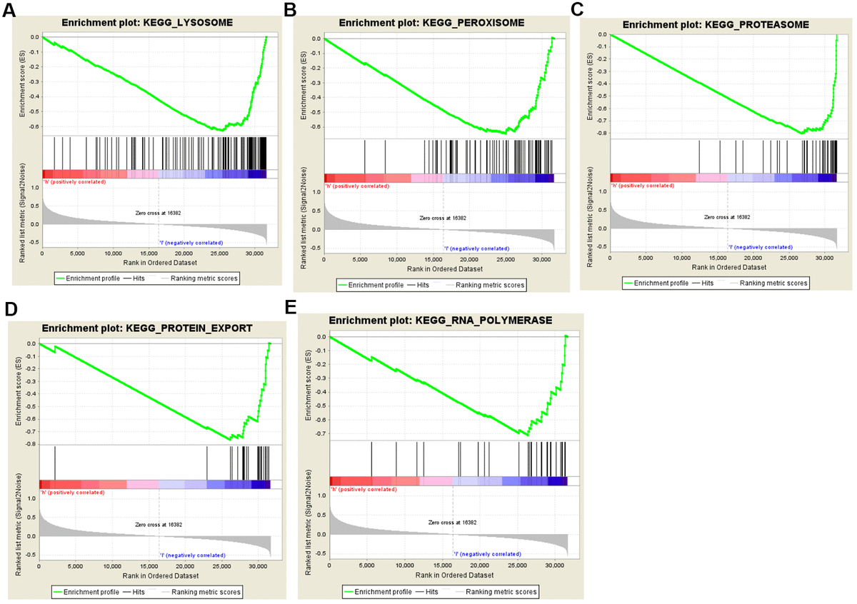 Figure 7. Gene set enrichment analysis (GSEA) of high-risk and low-risk prostate cancer patients based on the autophagy-related lncRNA prognostic signature. The GSEA analysis showed that samples with low-risk patients enriched in (A) lysosome, (B) peroxisome, (C) proteasome, (D) protein export, and (E) RNA polymerase pathways.