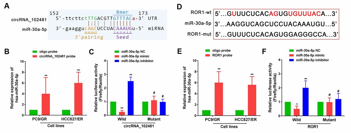 Figure 8. circRNA_102481 serves as a miR-30a-5p sponge to regulate ROR1 expression. The detailed potential binding sequences of circRNA_102481 to miR-30a-5p (A) and ROR1 to miR-30a-5p (D). miR-30a-5p of PC9/GR and HCC827/ER cells was abundantly pulled down by circRNA_102481 (B) or ROR1 (E). Dual-luciferase reporter assay confirmed that miR-30a-5p competitively targeted circRNA_102481(C), and that ROR1 is a direct target of miR-30a-5p (F). #p > 0.05, *p< 0.05, **p<0.01.