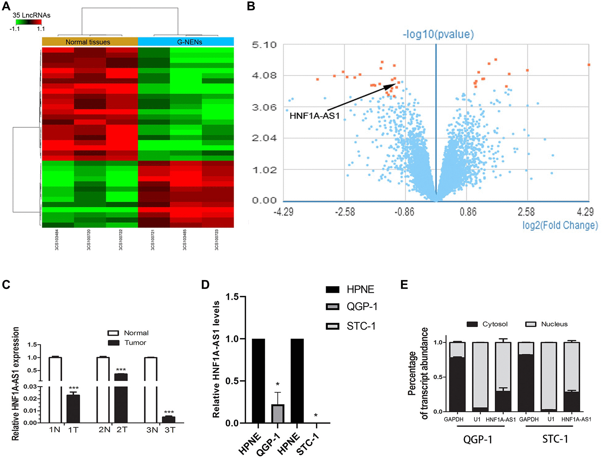 Figure 1. HNF1A-AS1 was down-regulated in human G-NENs tissues and GEP-NENs cells. (A) HNF1A-AS1 expression was analyzed by GeneChip assay in G-NENs tissues (n = 3) and peri-tumor tissues (>5 cm distant from cancer tissues) (n = 3). (B–C) HNF1A-AS1 was decreased in these three G-NENs tissues than in peri-tumor tissues. (D) HNF1A-AS1 expression was decreased in GEP-NENs cells than in human normal pancreatic cells HPNE as analyzed by qRT-PCR. (E) Isolation of nuclear and cytoplasmic fractions in QGP-1 and STC-1 cells suggested that HNF1A-AS1 was mainly localized in the nucleus. *p < 0.05, **p < 0.01.
