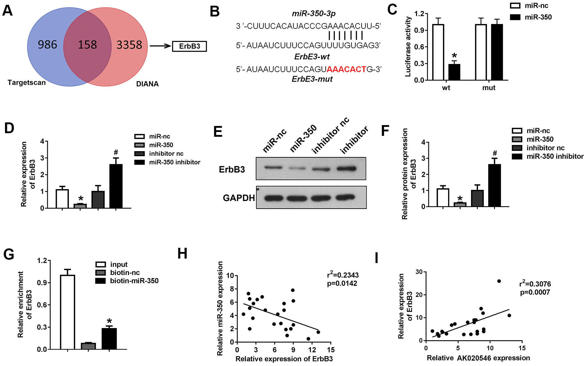Figure 7. MiR-350-3p directly targeted ErbB3 in H9c2 cardiomyocytes. (A) Bioinformatics analysis using TargetScan and DIANA predicted ErbB3 as the target of miR-350-3p. (B) The potential targeting region between miR-350-3p and ErbB3 predicted by bioinformatics analysis. (C) Luciferase assay was performed to verify whether miR-350-3p targeted ErbB3 in H9c2 cardiomyocytes (n = 5). (D) qPCR was used to detect the expression of ErbB3. (E, F) Western blot was carried out to evaluate the expression level of ErbB3 (n = 5). (G) Luciferase assay was performed to verify whether miR-350-3p targeted ErbB3 in H9c2 cardiomyocytes (n = 5). (H, I) Pearson’s analysis was performed to investigate the correlation between AK020546 and ErbB3 as well as miR-350-3p and ErbB3 (n = 5). *p < 0.05 vs miR-nc or biotin-nc, #p < 0.05 vs inhibitor nc group.
