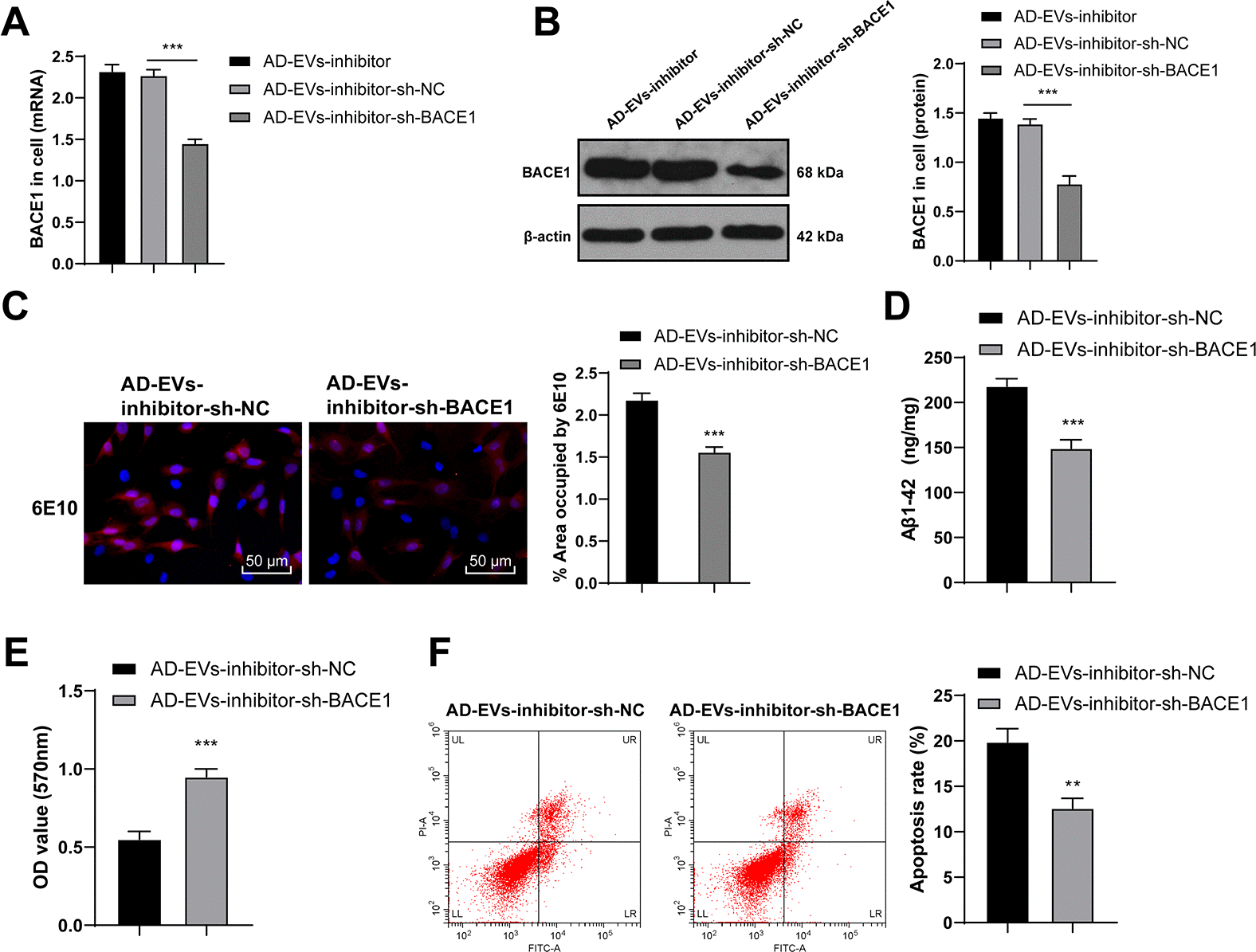Figure 6. BACE1 knockdown reverses the effects of EVs-inhibitor on AD. AD-EVs-inhibitor-treated neurons were transfected with BACE1 shRNA (AD-EVs-inhibitor-sh-BACE1), with AD-EVs-inhibitor-treated neurons transfected with sh-NC (AD-EVs-inhibitor-sh-NC) as control. (A, B) RT-qPCR and WB were used to detect the silencing effect of shRNA on BACE1; (C) Immunofluorescence assay was used to detect the content of Aβ in AD hippocampal neurons; (D) ELISA was used to detect level of Aβ1-42; (E) MTT assay was used to detect the viability of AD hippocampal neurons; (F) Flow cytometry was used to detect the apoptosis rate of AD hippocampal neurons. The experiment was repeated three times, and the data were expressed as mean ± standard deviation. Comparisons between two groups were analyzed using independent sample t-test; comparisons among multiple groups were analyzed using one-way ANOVA, followed by Tukey’s multiple comparisons test or Sidak’s multiple comparisons test. ***p < 0.001.