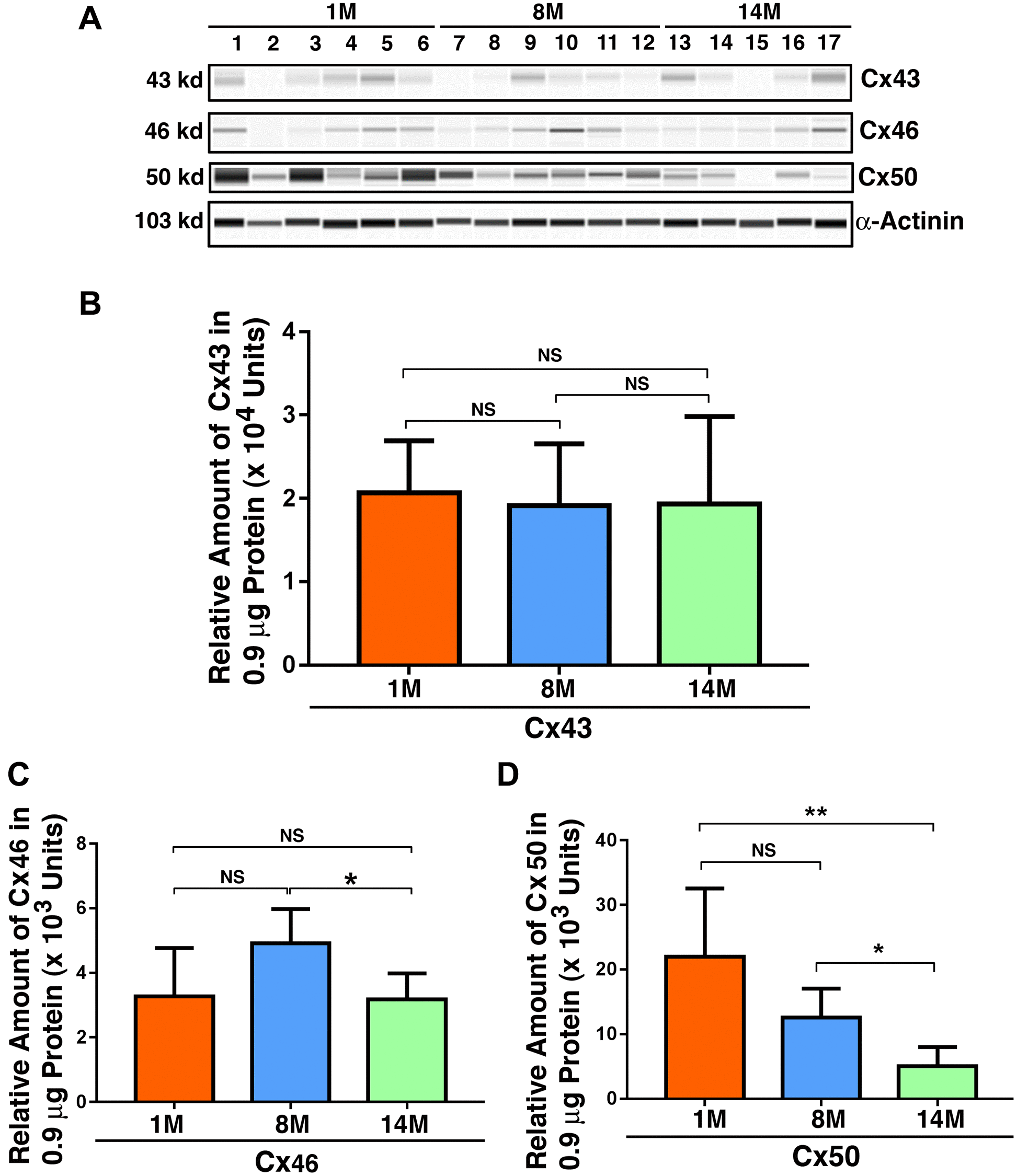 Figure 6. Age-dependent changes of the connexins Cx43, Cx46 and Cx50 in mouse lens epithelial samples of different age groups as determined by the automated western immunoblot (AWI) analyses. AWI was performed on a Wes (ProteinSimple) as described recently [