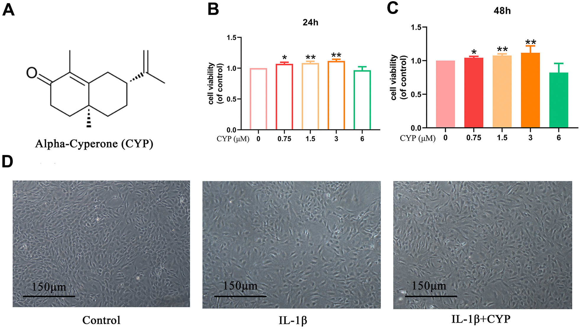 Figure 1. Effects of CYP on survival rate of chondrocytes. (A) Structural chemical formula of CYP. (B, C) CYP’s cytotoxicity of in an increasing concentration (0, 0.75, 1.5, 3, 6 μM) on chondrocytes as measured by CCK-8 assay after a 24 or 48-hour incubation. (D) Morphology of chondrocytes as observed under a microscope following treatment by IL-1β (10 ng/ml) combined with or without CYP (3 μM) after 24 hours of incubation (scale bar: 150 μm). Data presented are means ± S.D. of five independent experiments. * p < 0.05 and ** p < 0.01 vs. the control group, n=5.