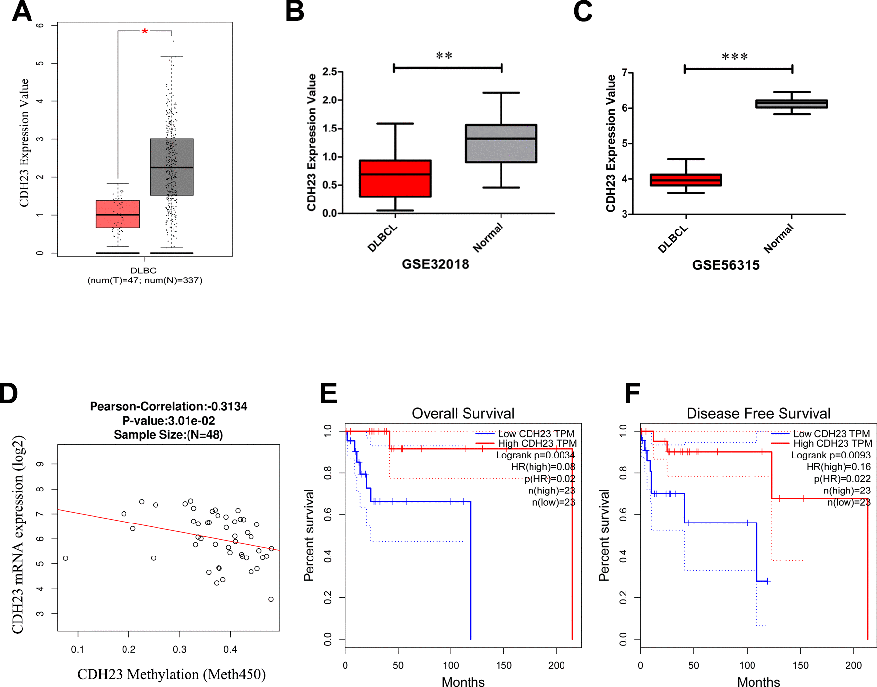 Figure 1. The expression level, epigenetic regulation and prognostic value of CDH23 in DLBCL. (A) The expression level of CDH23 in DLBCL samples and paired normal samples determined by GEPIA. (B) The expression level of CDH23 in DLBCL samples and paired normal samples in GSE32018 dataset. (C) The expression level of CDH23 in DLBCL samples and paired normal samples in GSE56315 dataset. (D) The correlation of CDH23 expression and methylation value in DLBCL via LinkedOmics analysis. (E) The relationship between CDH23 expression and overall survival of DLBCL patients via GEPIA analysis. (F) The relationship between CDH23 expression and disease free survival of DLBCL patients via GEPIA analysis.