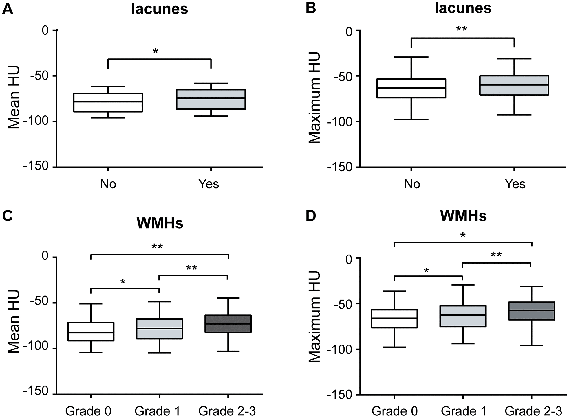 Figure 1. Association between pericarotid fat and MRI markers of CSVD. Pericarotid fat density was associated with the presence of lacunes, (A) for mean HU, and (B) for maximum HU. Pericarotid fat density was associated with the different grades of WMHs, (C) for mean HU, and (D) for maximum HU. In the box-and-whisker plots, the lower and upper ends of the box represent the 25th and 75th percentiles, and the peripheral lines extending to the outer fences represent the 10th and 90th percentiles, respectively. *<0.05; **<0.01. Abbreviation, WMHs, white matter hyperintensities, HU, hounsfield unit.