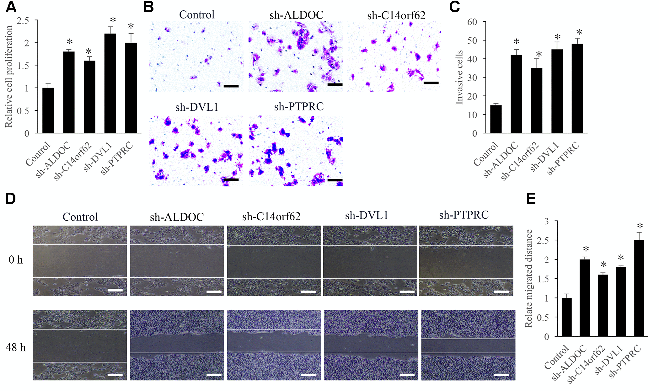 Figure 7. Influence of ALDOC, C14orf62, DVL1, and PTPRC on the proliferation, migration, and invasion of TC cells. (A) Influence of ALDOC, C14orf62, DVL1, and PTPRC on the proliferation of TC cells. (B) Influence of ALDOC, C14orf62, DVL1, and PTPRC on the invasion of TC cells (Scale bar=50 μm). (C) Quantitative analysis of the influence of ALDOC, C14orf62, DVL1, and PTPRC on the invasion of TC cells. (D) Influence of ALDOC, C14orf62, DVL1, and PTPRC on the migration of TC cells (Scale bar=500 μm). (E) Quantitative analysis of the influence of ALDOC, C14orf62, DVL1, and PTPRC on the migration of TC cells.