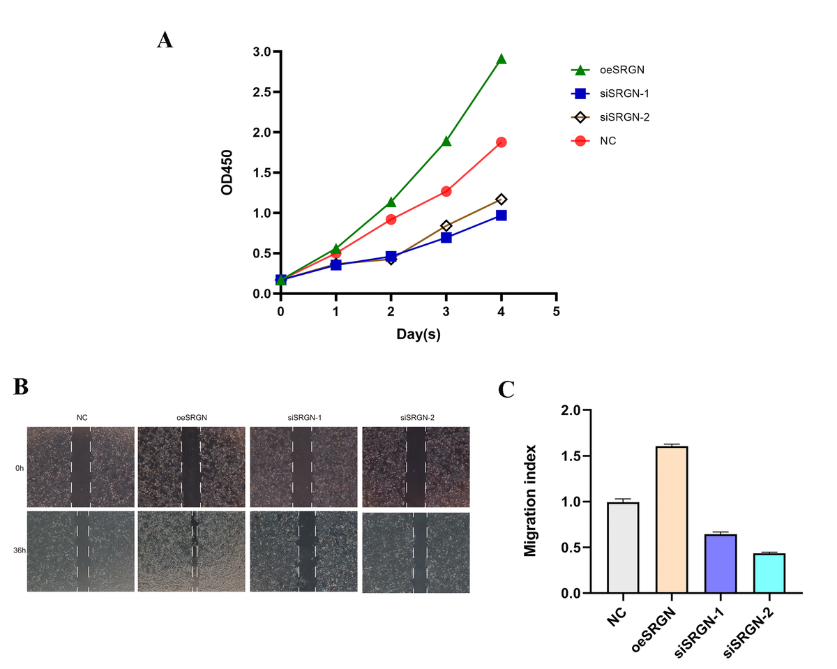 Figure 6.SRGN knockdown inhibited the proliferation of OS cells. (A) The effect of upregulation and silencing of SRGN on proliferation in 143B cells was detected by CCK8. (B) and (C) The migration ability of 143B cells was investigated.