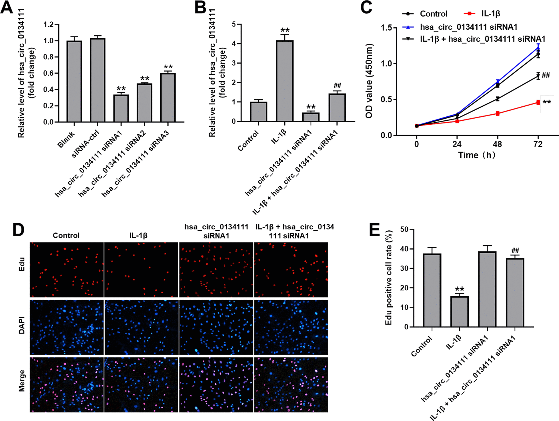 Figure 1. Hsa_circ_0134111 knockdown prevents IL-1β-induced growth inhibition in chondrocytes. (A) Chondrocytes were treated with hsa_circ_0134111 siRNA-ctrl, hsa_circ_0134111 siRNA1, hsa_circ_0134111 siRNA2, or hsa_circ_0134111 siRNA3 and RT-qPCR was performed to measure knockdown efficiency. (B) Chondrocytes were treated with IL-1β and hsa_circ_0134111 siRNA1, alone or in combination, and RT-qPCR was performed to measure hsa_circ_0134111 levels in cells. (C) Results of the CCK-8 assay, used to detect cell viability. (D, E) EdU and DAPI staining was used to measure chondrocyte proliferation. **P<0.01 compared with control; ##P<0.01 compared with hsa_circ_0134111 siRNA1.