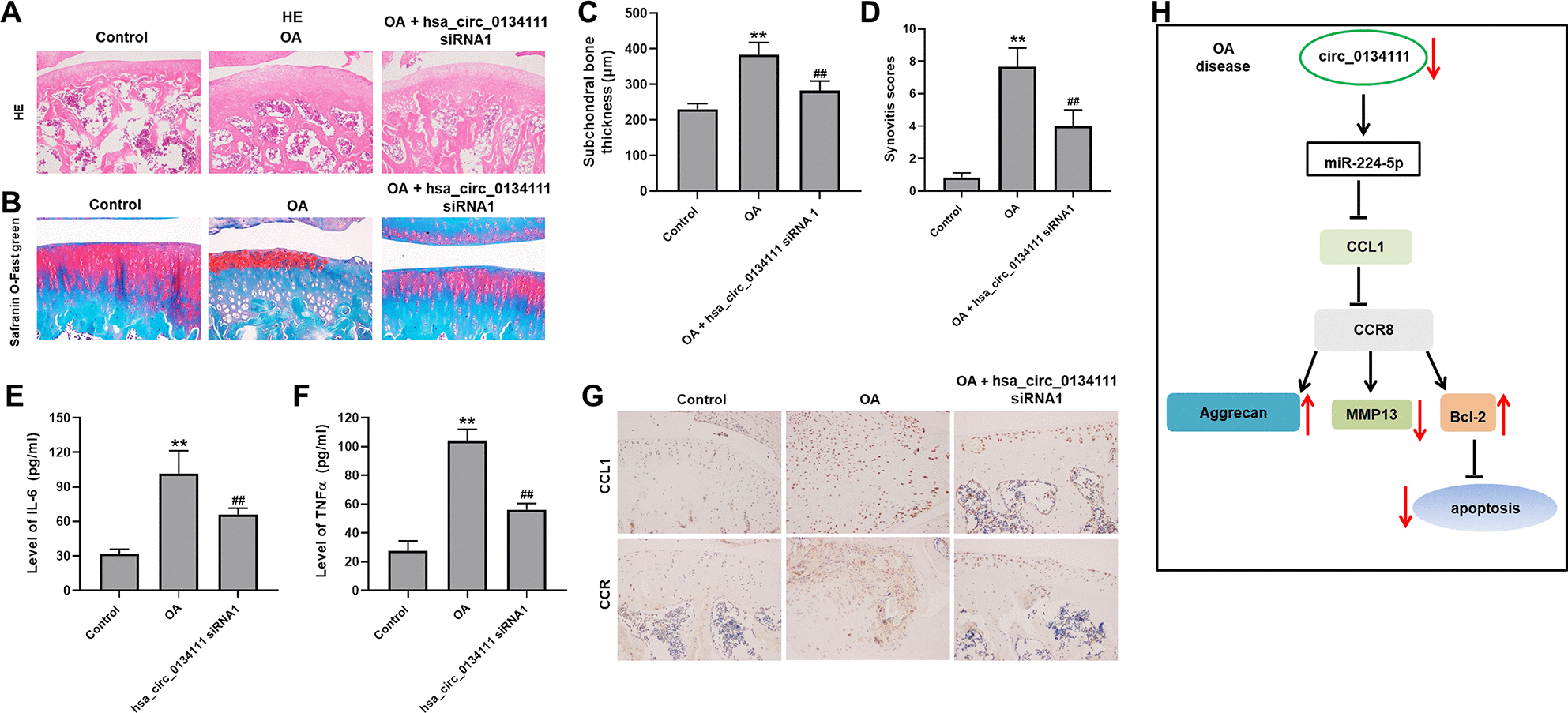 Figure 6. Hsa_circ_0134111 knockdown alleviates the symptoms of OA in vivo. Representative images of knee articular tissue stained with (A) H&E and (B) Safranin O/Fast Green. (C) Subchondral bone thickness measurements. (D) Synovitis scores for knee joints in the different experimental treatments. (E, F) ELISA-based measurements of IL-6 and TNF-α levels in knee synovia. (G) Representative IHC images showing the expression of CCL1 and CCR8 in knee joint tissue. (H) A graphical abstract of this study. **P<0.01, compared with control; ##P<0.01, compared with OA.