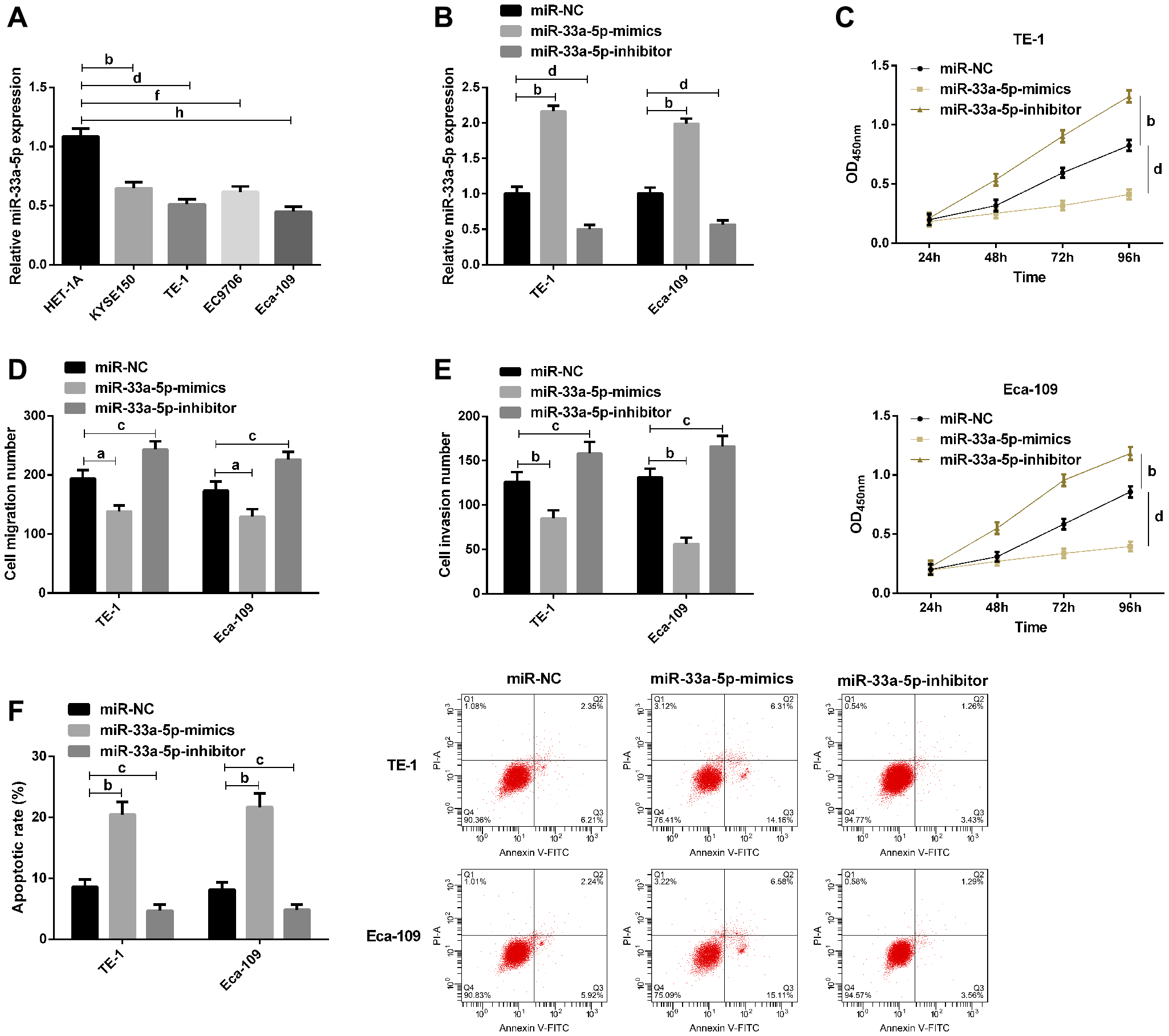 Figure 2. Effects of miR-129-5p on biological function of esophageal cancer cells. (A) qRT-PCR detection of miR-33a-5p expression in esophageal cancer cells by; (B) qRT-PCR detection of miR-33a-5p expression in TE-1, Eca-109 after transfection with miR-NC, miR-33a-5p-mimics, miR-33a-5p-inhibitor; (C) Cell proliferation of TE-1 and Eca-109 by CCK-8; (D) Migration number of TE-1 and Eca-109 cells by Transwell; (E) Invasion number of TE-1 and Eca-109 cells by Transwell; (F) Apoptosis rate of TE-1 and Eca-109 cells by flow cytometry and the apoptosis diagram. The inter-group comparison was conducted by the independent sample t-test, multiple time point data were analyzed by repeated measures analysis of variance (ANOVA), mean ± SD, bP < 0.01, cP < 0.05, dP < 0.01, fP < 0.01, and hP < 0.01 for inter-group comparisons.