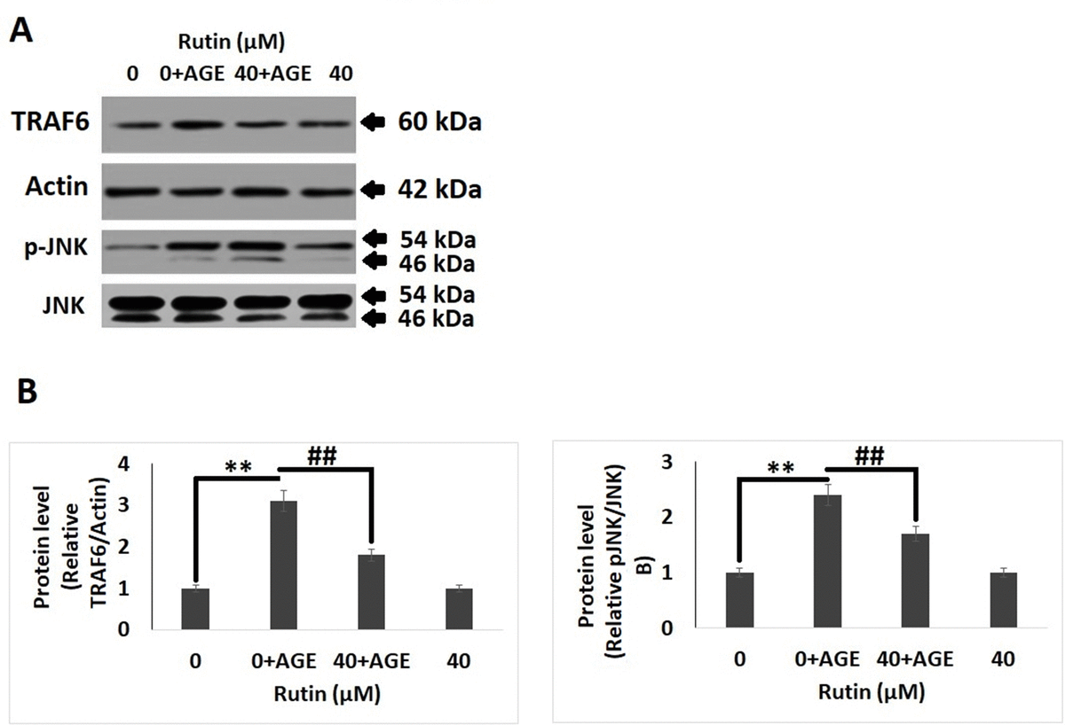 Figure 5. Rutin inhibits AGE-induced MAPK pathway proteins in chondrocytes. (A) Western blot analysis showing protein expression of TRAF6 and p-JNK. (B) Quantitative results showing relative expression of TRAF6 and JNK. The results were mean ± SD. **P<0.01 compared to control group, ##P<0.01 compared to AGEs alone treated group.